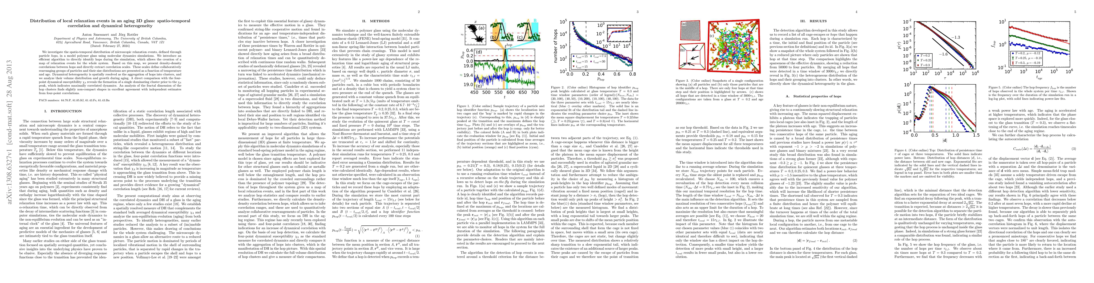 We investigate the spatio-temporal distribution of microscopic relaxation events, defined through particle hops, in a model polymer glass using molecular dynamics simulations. We introduce an efficient algorithm to directly identify hops during the simulation, which allows the creation of a map of relaxation events for the whole system. Based on this map, we present density-density correlations between hops and directly extract correlation scales. These scales define collaboratively rearranging groups of particles and their size distributions are presented as a function of temperature and age. Dynamical heterogeneity is spatially resolved as the aggregation of hops into clusters, and we analyze their volume distribution and growth during aging. A direct comparison with the four-point dynamical susceptibility {\chi}4 reveals the formation of a single dominating cluster prior to the {\chi}4 peak, which indicates maximally correlated dynamics. An analysis of the fractal dimension of the hop clusters finds slightly non-compact shapes in excellent agreement with independent estimates from four-point correlations.