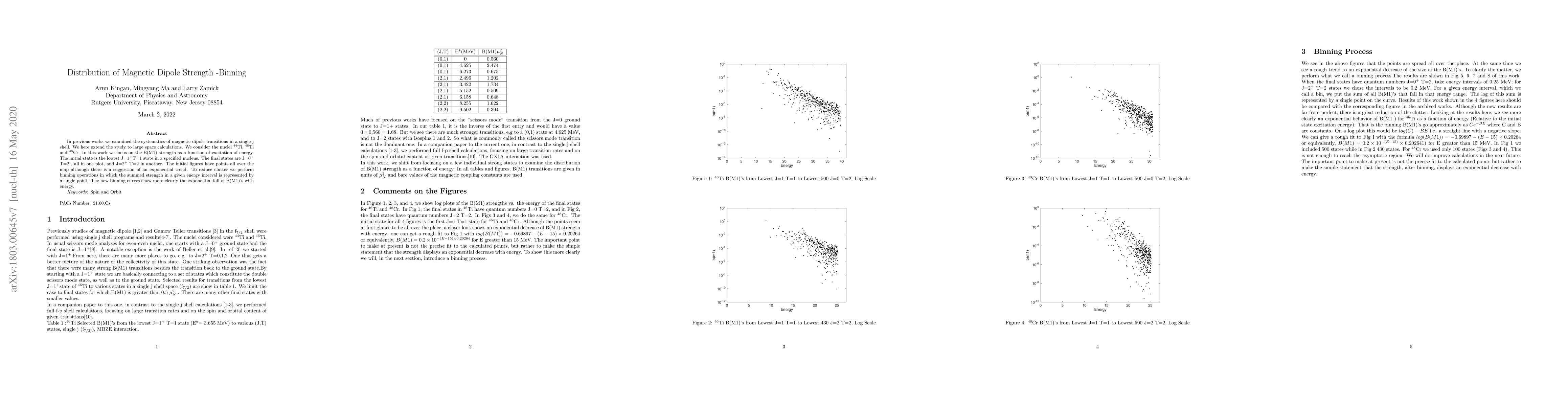 In previous works we examined the systematics of magnetic dipole transitions in a single j shell. We here extend the study to large space calculations. We consider Ti and Cr isotopes.. In this work we focus on the B(M1) strength as a function of excitation of energy. The initial state is the lowest J= state. T=1 state in a specified nucleus. The final states are J=0 T=2 , all in one plot, and J=2 T=2 in another. The initial figures have points all over the map although there is a suggestion of an exponential trend. To reduce clutter we perform binning operations in which the summed strength in a given energy interval is represented by a single point. The new binning curves show more clearly the exponential fall of B(M1)'s with energy.