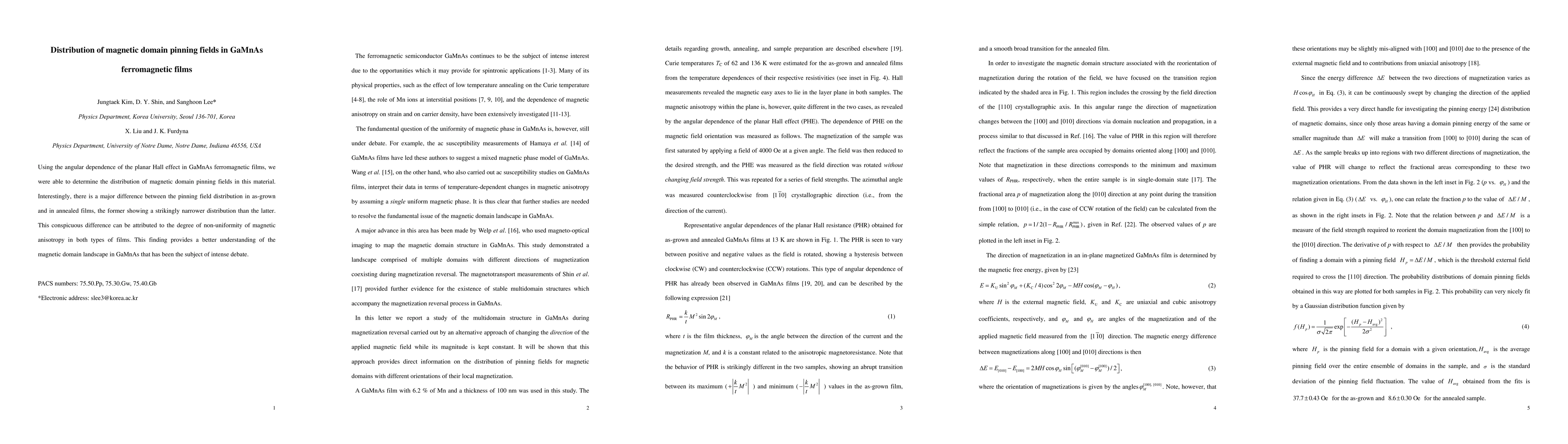 Summary: The study investigates the distribution of magnetic domain pinning fields in GaMnAs ferromagnetic films, revealing a significantly narrower distribution in as-grown films compared to annealed ones, attributed to differences in magnetic anisotropy non-uniformity, enhancing understanding of GaMnAs's magnetic domain landscape.