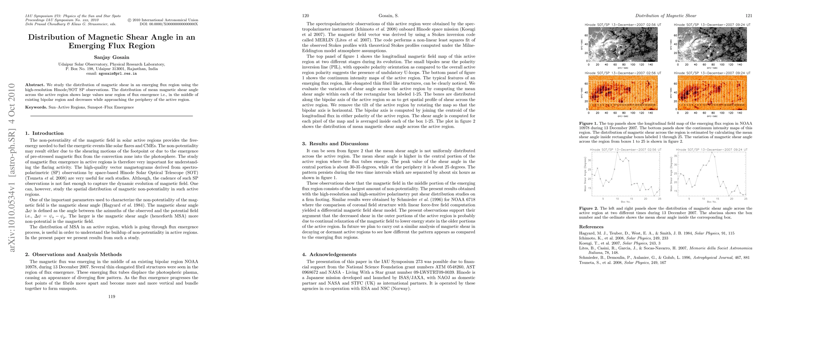 We study the distribution of magnetic shear in an emerging flux region using the high-resolution Hinode/SOT SP observations. The distribution of mean magnetic shear angle across the active region shows large values near region of flux emergence i.e., in the middle of existing bipolar region and decreases while approaching the periphery of the active region.