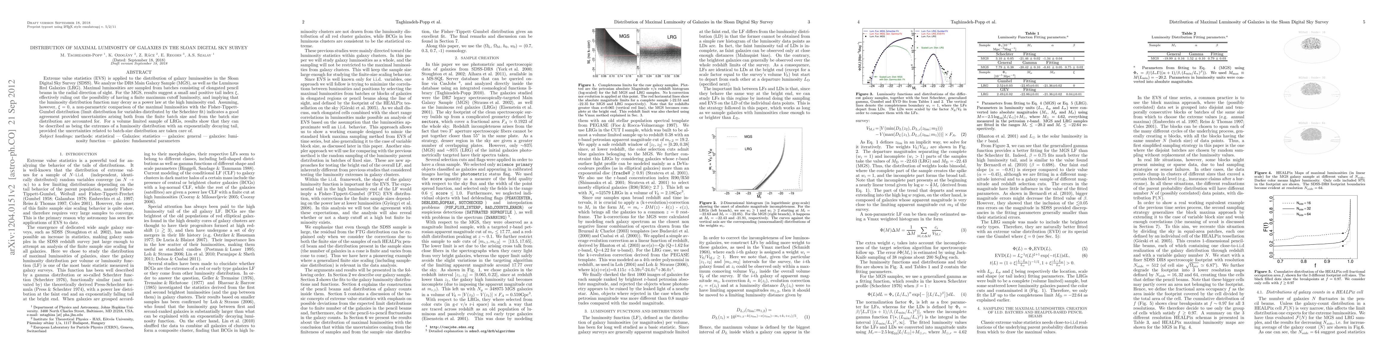 Extreme value statistics (EVS) is applied to the distribution of galaxy luminosities in the Sloan Digital Sky Survey (SDSS). We analyze the DR8 Main Galaxy Sample (MGS), as well as the Luminous Red Galaxies (LRG). Maximal luminosities are sampled from batches consisting of elongated pencil beams in the radial direction of sight. For the MGS, results suggest a small and positive tail index $\xi$, effectively ruling out the possibility of having a finite maximum cutoff luminosity, and implying that the luminosity distribution function may decay as a power law at the high luminosity end. Assuming, however, $\xi=0$, a non-parametric comparison of the maximal luminosities with the Fisher-Tippett-Gumbel distribution (limit distribution for variables distributed by the Schechter fit) indicates a good agreement provided uncertainties arising both from the finite batch size and from the batch size distribution are accounted for. For a volume limited sample of LRGs, results show that they can be described as being the extremes of a luminosity distribution with an exponentially decaying tail, provided the uncertainties related to batch-size distribution are taken care of.