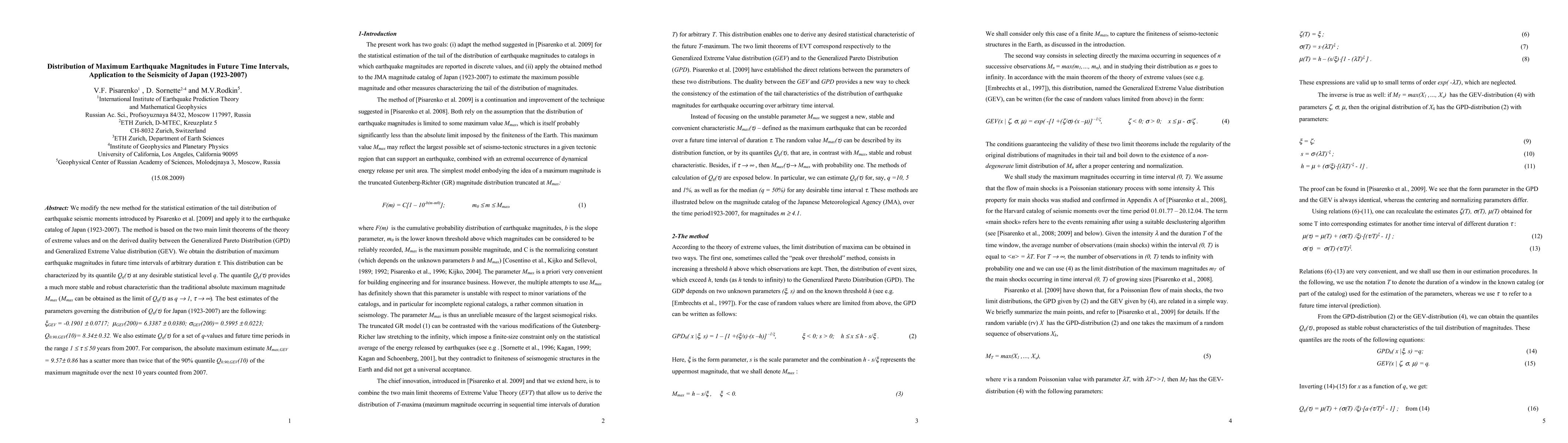 This paper modifies a statistical method for estimating the tail distribution of earthquake seismic moments, applying it to Japan's seismic catalog (1923-2007). The method yields a more stable distribution of maximum earthquake magnitudes for future intervals, characterized by quantiles Qq(tau), which are more robust than the traditional absolute maximum magnitude Mmax.