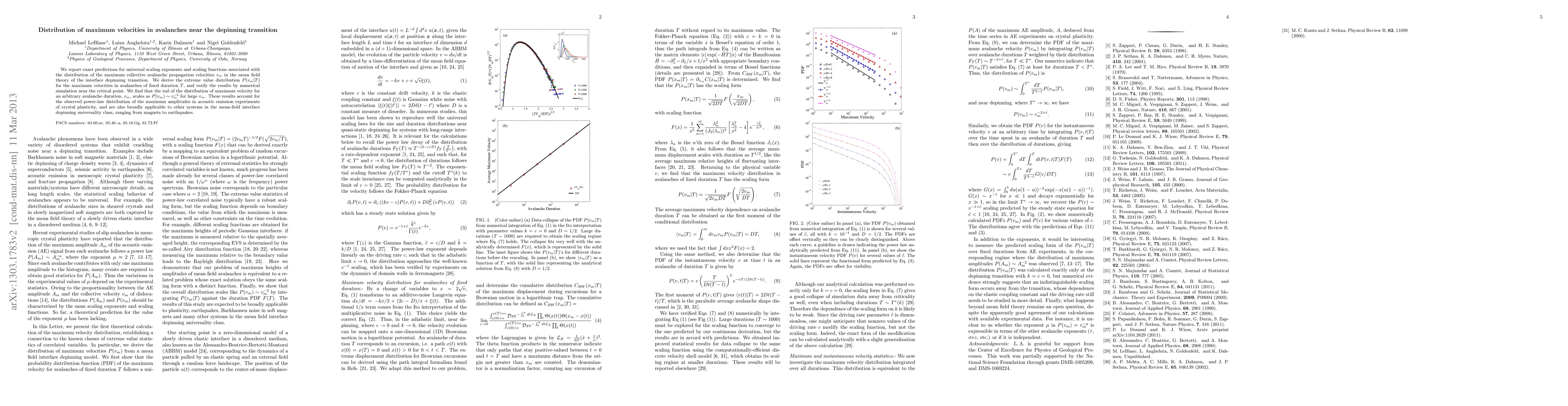 This paper presents exact predictions for scaling exponents and functions related to the distribution of maximum avalanche velocities near the depinning transition, showing a power-law tail $P(v_m)\sim v_m^{-2}$ for large velocities, verified by numerical simulations and applicable to various systems in the mean-field interface depinning class.