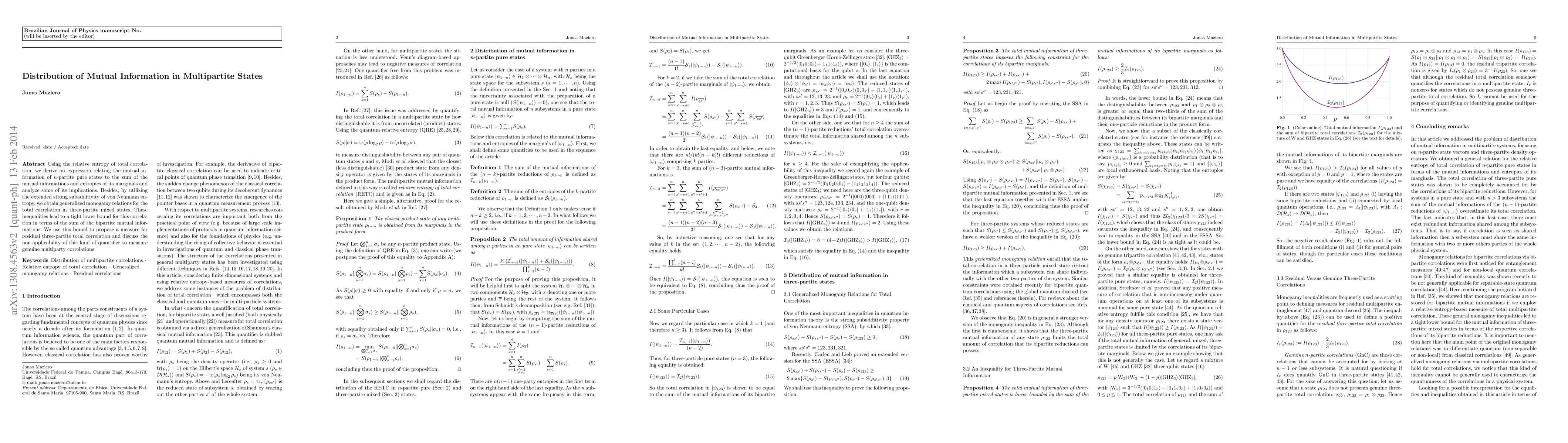 Using the relative entropy of total correlation, we derive an expression relating the mutual information of $n$-partite pure states to the sum of the mutual informations and entropies of its marginals and analyze some of its implications. Besides, by utilizing the extended strong subadditivity of von Neumann entropy, we obtain generalized monogamy relations for the total correlation in three-partite mixed states. These inequalities lead to a tight lower bound for this correlation in terms of the sum of the bipartite mutual informations. We use this bound to propose a measure for residual three-partite total correlation and discuss the non-applicability of this kind of quantifier to measure genuine multiparty correlations.