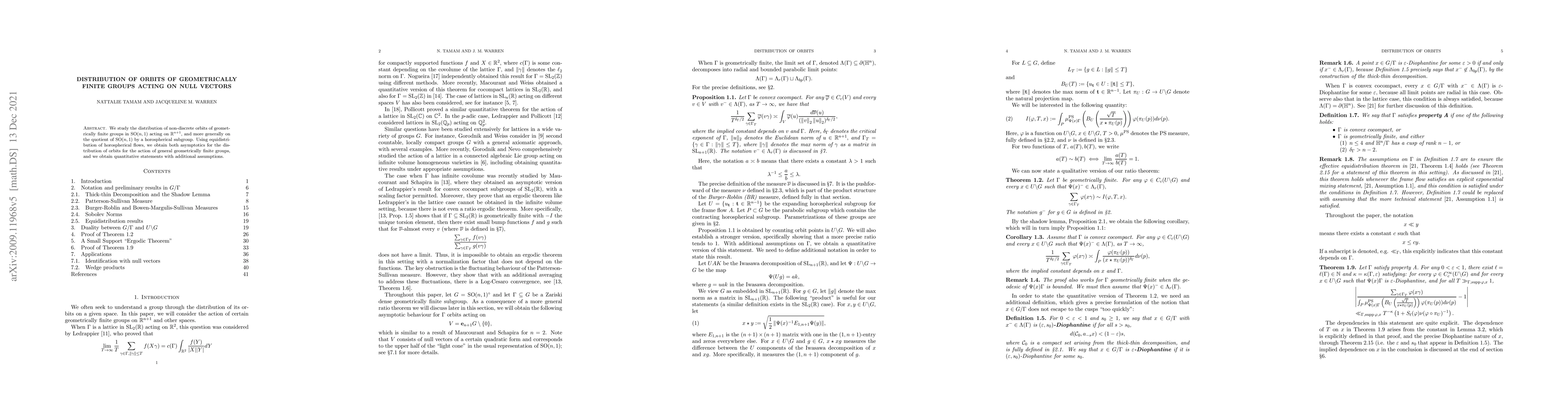 This paper investigates the distribution of non-discrete orbits of geometrically finite groups in $\operatorname{SO}(n,1)$ acting on $\mathbb{R}^{n+1}$, deriving asymptotics and quantitative results using equidistribution of horospherical flows.