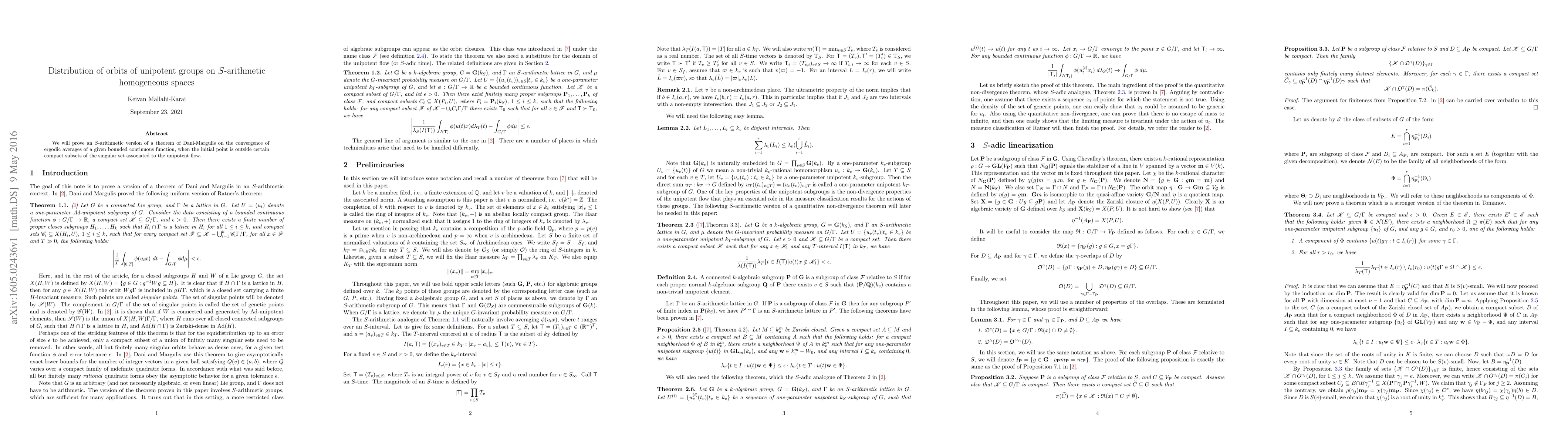 We will prove an S-arithmetic version of a theorem of Dani-Margulis on the convergence of ergodic averages of a given bounded continuous function, when the initial point is outside certain compact subsets of the singular set associated to the unipotent flow.