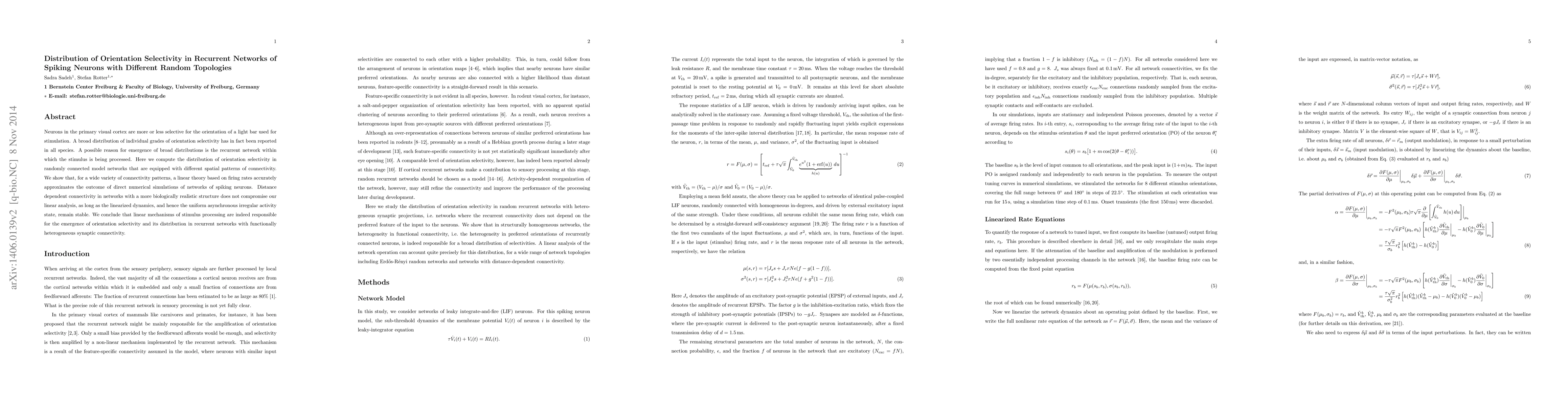 This paper investigates how orientation selectivity in spiking neuron networks arises from recurrent connections with different random topologies. The study finds that linear theories based on firing rates accurately predict the distribution of orientation selectivity, even in networks with biologically realistic connectivity patterns, suggesting that linear mechanisms underpin the emergence of this selectivity.