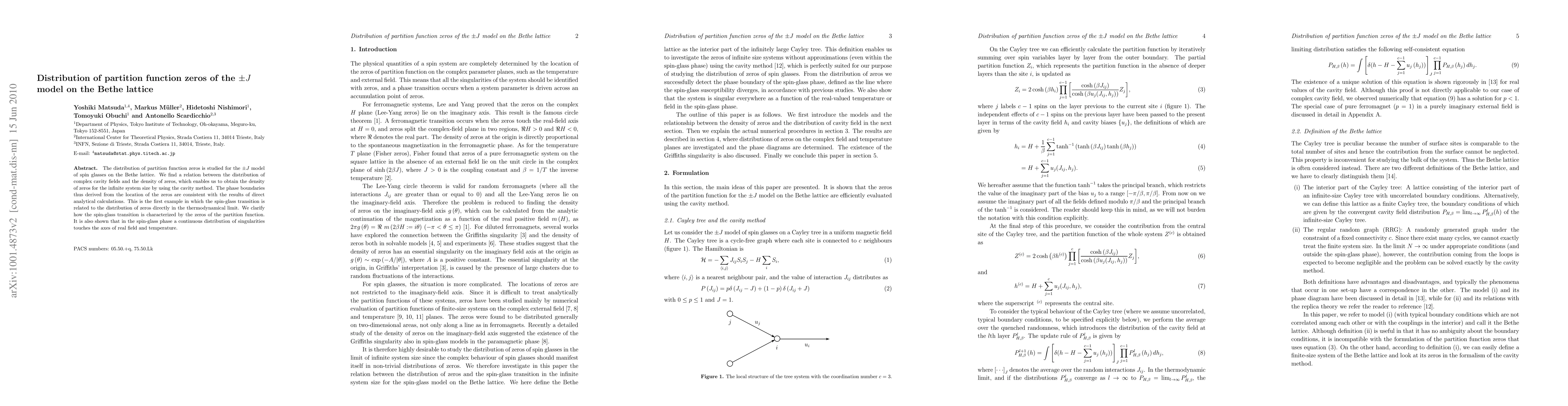 This paper investigates the distribution of partition function zeros in the $\pm J$ spin glass model on the Bethe lattice, revealing a connection between zeros and complex cavity fields. The study uses the cavity method to derive phase boundaries consistent with analytical calculations, marking the first direct link between spin glass transition and zero distribution in the thermodynamical limit.