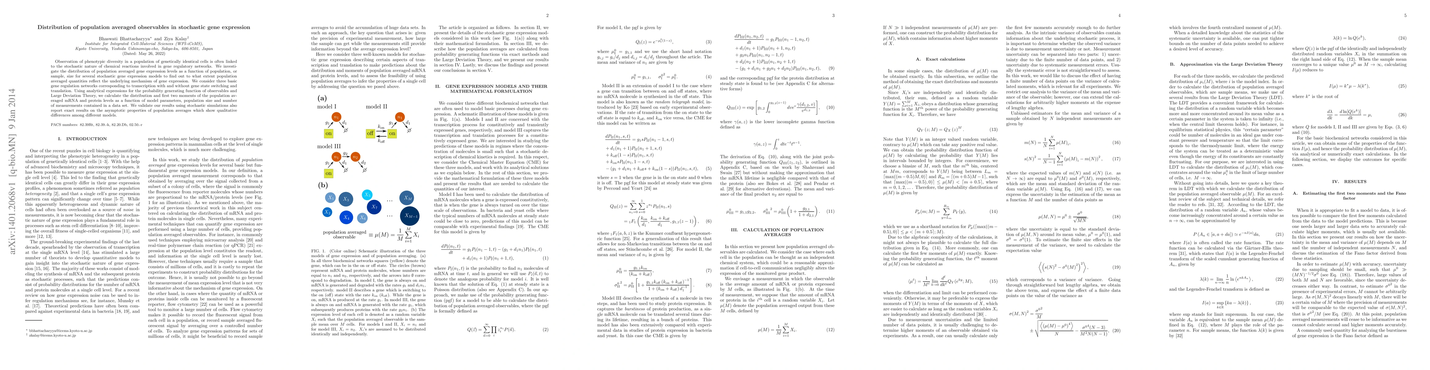 This paper investigates the distribution of population averaged gene expression levels in genetically identical cells, focusing on how sample size affects these averages. Analytical and simulation methods reveal distinct asymptotic properties and first two moments of mRNA and protein levels across different gene regulation models, highlighting the stochastic nature of gene expression.