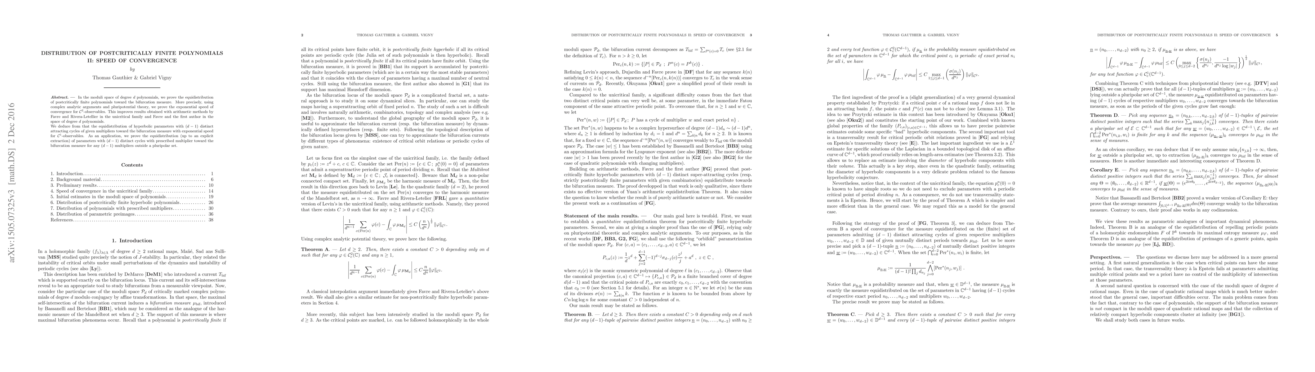 In the moduli space of degree d polynomials, we prove the equidistribution of postcritically finite polynomials toward the bifurcation measure. More precisely, using complex analytic arguments and pluripotential theory, we prove the exponential speed of convergence for C 2-observables. This improves results obtained with arithmetic methods by Favre and Rivera-Letellier in the unicritical family and Favre and the first author in the space of degree d polynomials. We deduce from that the equidistribution of hyperbolic parameters with (d -- 1) distinct attracting cycles of given multipliers toward the bifurcation measure with exponential speed for C 1-observables. As an application, we prove the equidistribution (up to an explicit extraction) of parameters with (d -- 1) distinct cycles with prescribed multiplier toward the bifurcation measure for any (d -- 1) multipliers outside a pluripolar set.