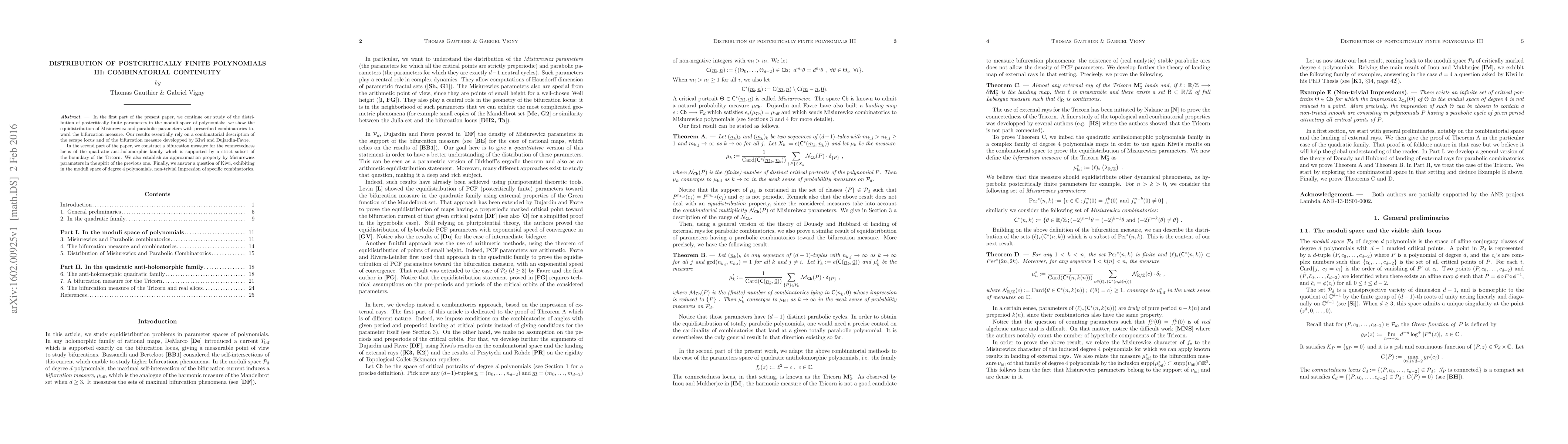 In the first part of the present paper, we continue our study of distribution of postcritically finite parameters in the moduli space of polynomials: we show the equidistribution of Misiurewicz parameters with prescribed combinatorics toward the bifurcation measure. Our results essentially rely on a combinatorial description of the escape locus and of the bifurcation measure developped by Kiwi and Dujardin-Favre. In the second part of the paper, we construct a bifurcation measure for the connectedness locus of the quadratic anti-holomorphic family which is supported by a strict subset of the boundary of the Tricorn. We also establish an approximation property by Misiurewicz parameters in the spirit of the previous one. Finally, we answer a question of Kiwi, exhibiting in the moduli space of degree 4 polynomials, non-trivial Impression of specific combinatorics.