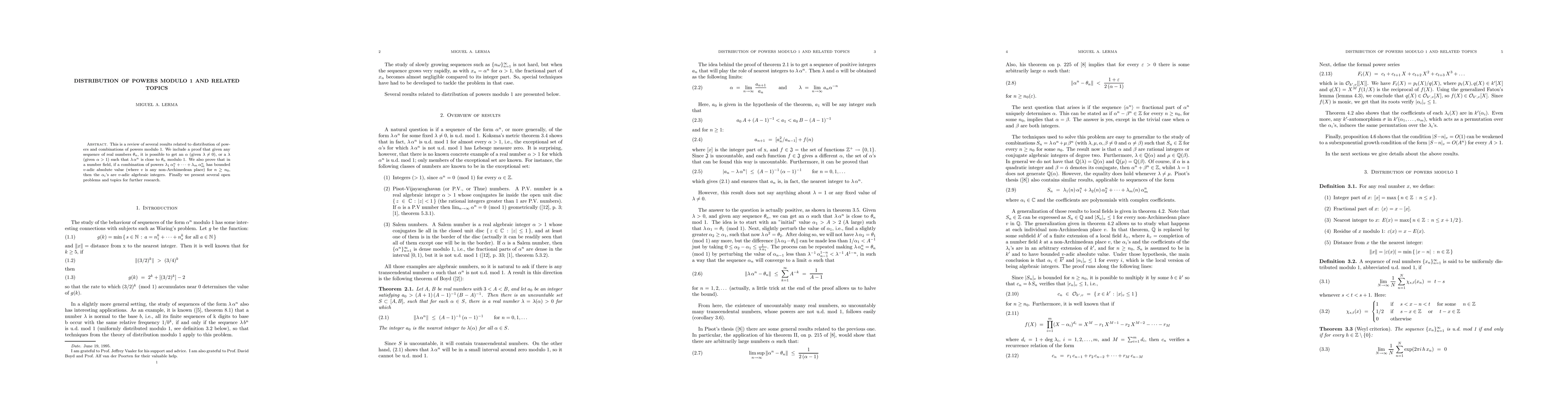 This is a review of several results related to distribution of powers and combination of powers modulo 1. We include a proof that given a sequence of real numbers $\theta_n$, it is possible to get an $\alpha$ (given $\lambda \ne 0$), or a $\lambda$ (given $\alpha > 1$) such that $\lambda \alpha^n$ is close to $\theta_n$ modulo 1. We also prove that in a number field, if a combination of powers $\lambda_1 \alpha_1^n + \cdots + \lambda_m \alpha_m^n$ has bounded $v$-adic absolute value (where $v$ is any non-Archimedian place) for $n \geq n_0$, then the $\alpha_i$'s are algebraic integers. Finally we present several open problem and topics for further research.