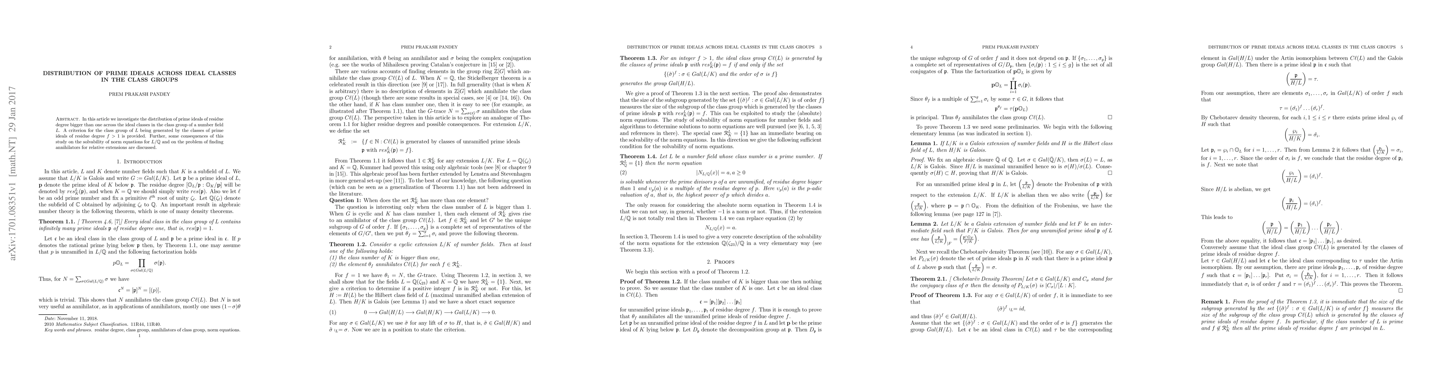 This paper studies the distribution of prime ideals with higher residue degree across ideal classes in the class group of a number field $L$, providing a criterion for the class group's generation by such prime ideals and discussing implications for norm equation solvability and annihilator finding in relative extensions.