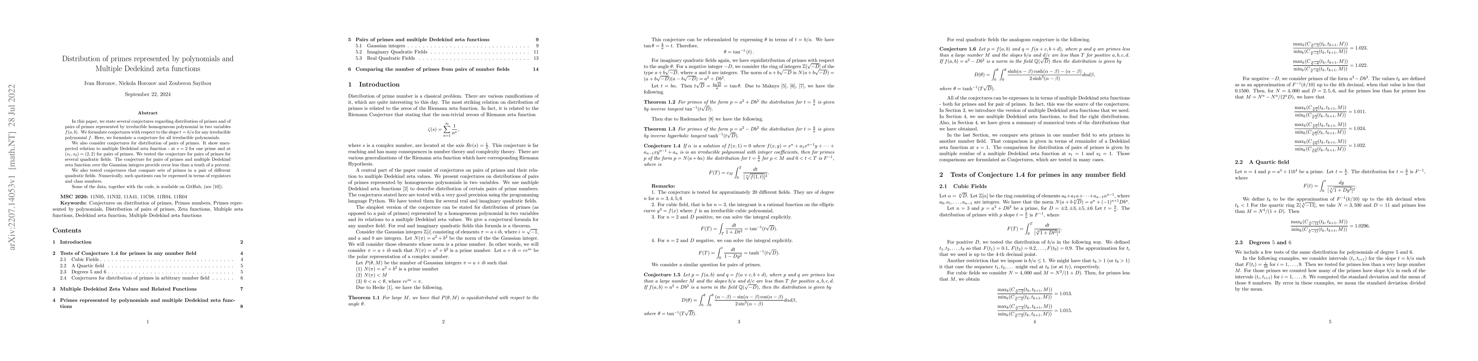 This paper proposes conjectures on the distribution of primes and pairs of primes represented by irreducible polynomials in two variables, linking them to multiple Dedekind zeta functions at specific values. Numerical tests show strong support for the conjectures, particularly for pairs of primes over quadratic fields.