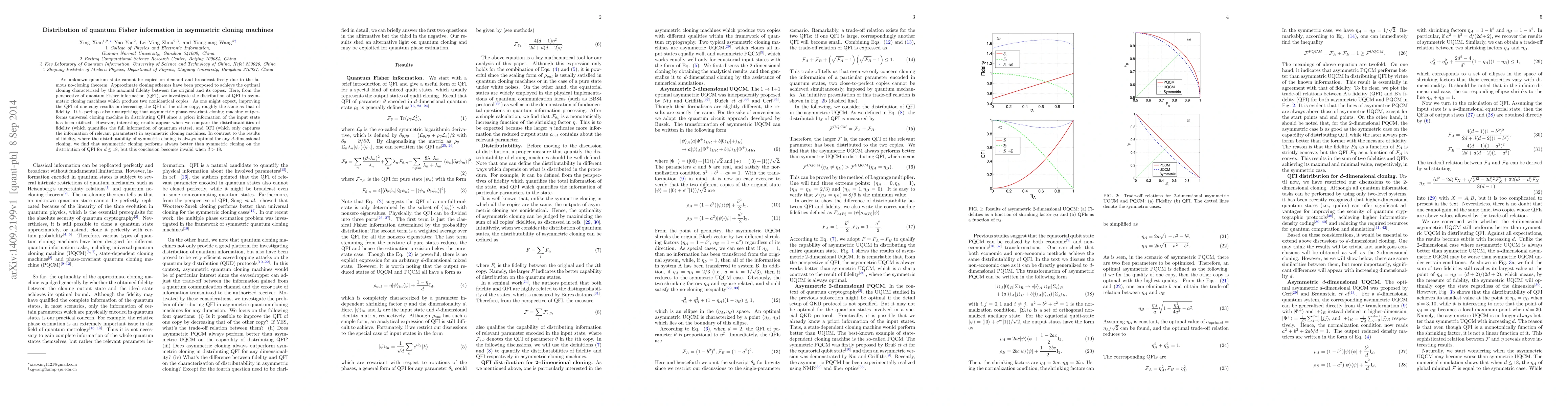 This paper investigates the distribution of quantum Fisher information in asymmetric cloning machines that produce two nonidentical copies, finding that asymmetric phase-covariant cloning outperforms universal cloning in distributing QFI. It reveals that asymmetric cloning generally outperforms symmetric cloning in distributing QFI for dimensions $d\leq18$, but this is not true for $d>18$.