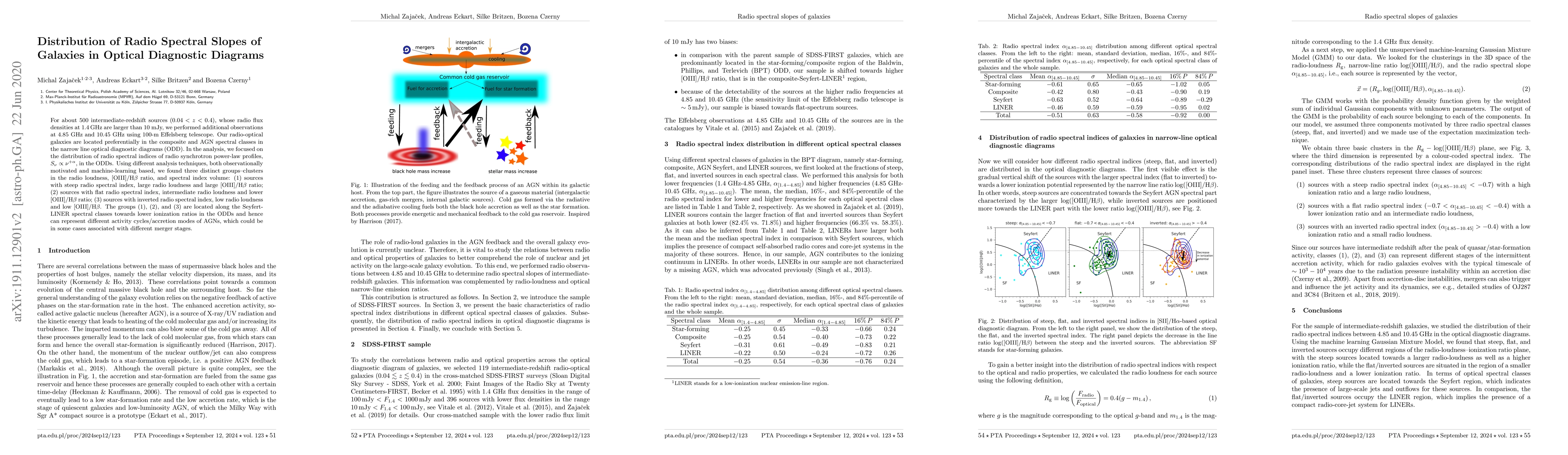 This study investigates the distribution of radio spectral slopes for 500 intermediate-redshift galaxies using observations at 1.4 GHz, 4.85 GHz, and 10.45 GHz. The galaxies predominantly fall into composite and AGN classes in optical diagnostic diagrams, revealing three distinct groups based on radio spectral indices, radio loudness, and [OIII]/Hβ ratios, potentially representing different AGN activity cycles and merger stages.