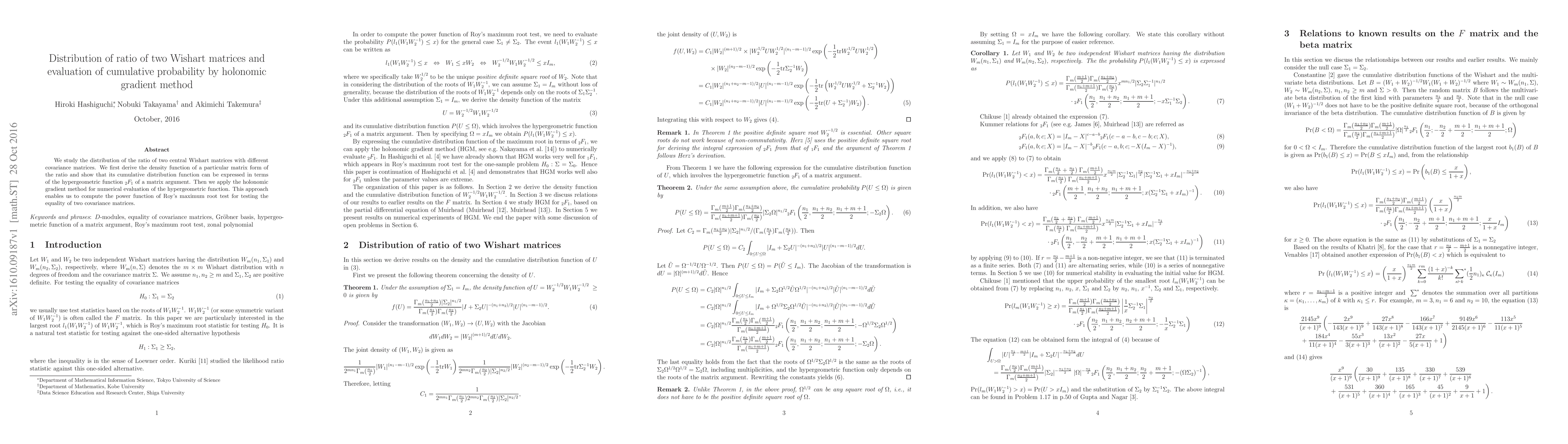 This paper studies the distribution of the ratio of two central Wishart matrices with different covariance matrices, using a novel approach to evaluate its cumulative probability function, enabling the computation of power functions for statistical tests.