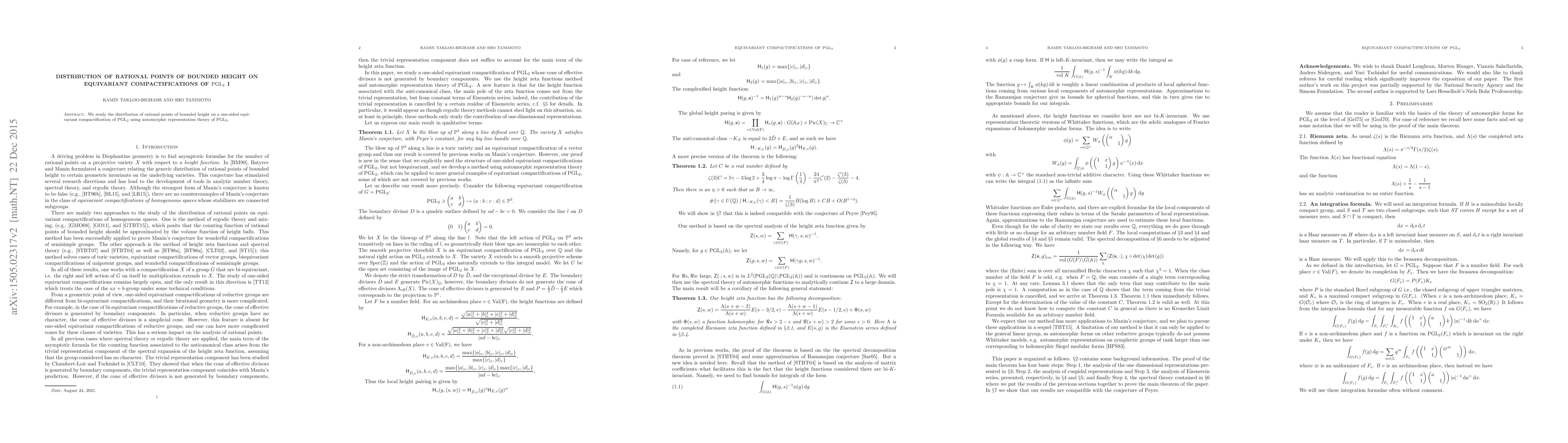 We study the distribution of rational points of bounded height on a one-sided equivariant compactification of $\mathrm{PGL}_2$ using automorphic representation theory of $\mathrm{PGL}_2$.