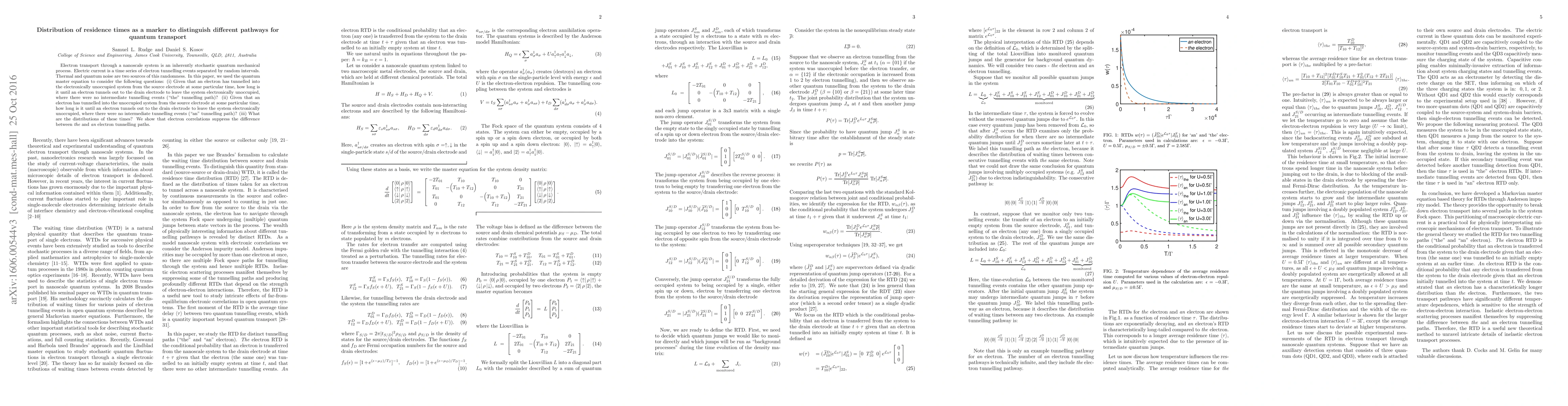 This paper investigates the stochastic nature of electron transport in nanoscale systems using quantum master equations to analyze residence times between electron tunnelling events. It finds that electron correlations minimize the differences in residence times between distinct tunnelling pathways.