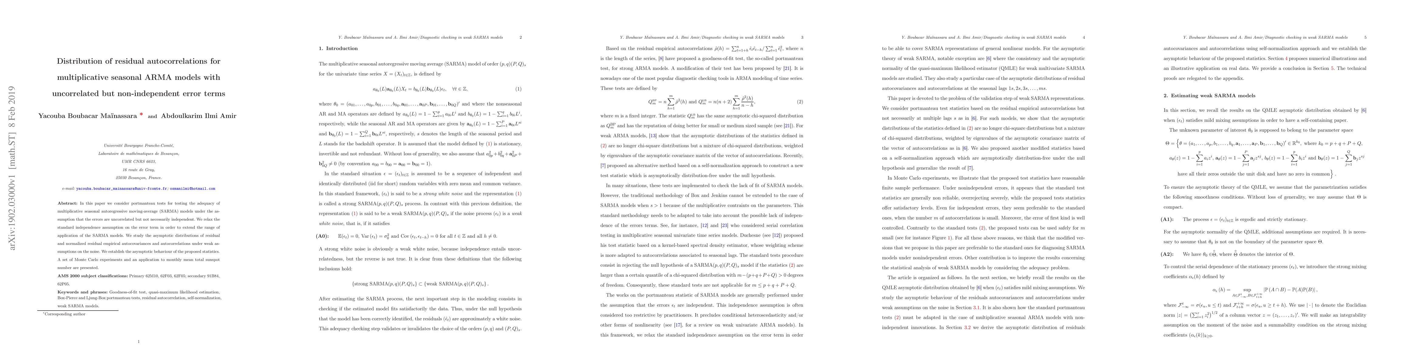 In this paper we consider portmanteau tests for testing the adequacy of multiplicative seasonal autoregressive moving-average (SARMA) models under the assumption that the errors are uncorrelated but not necessarily independent.We relax the standard independence assumption on the error term in order to extend the range of application of the SARMA models.We study the asymptotic distributions of residual and normalized residual empirical autocovariances and autocorrelations underweak assumptions on the noise. We establish the asymptotic behaviour of the proposed statistics. A set of Monte Carlo experiments and an application to monthly mean total sunspot number are presented.