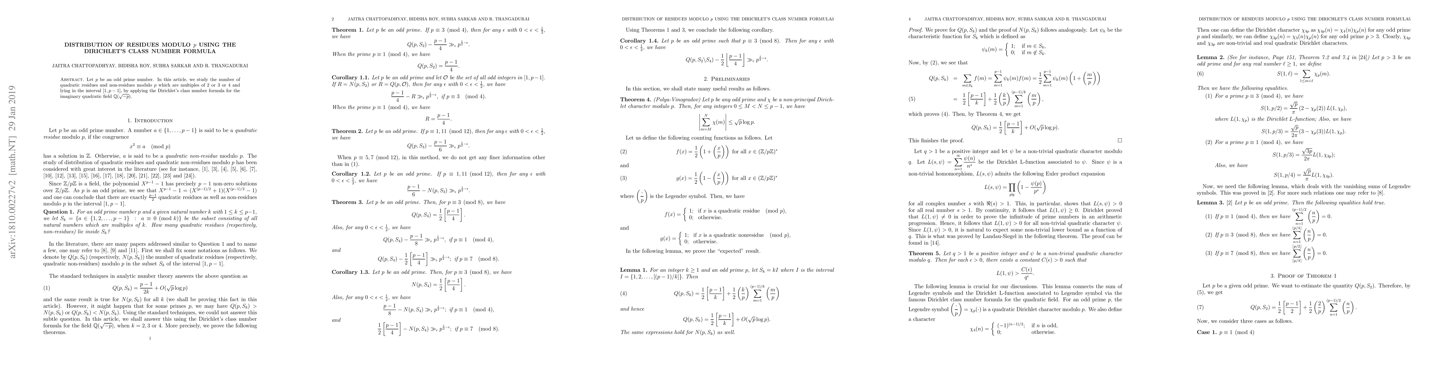 This paper investigates the distribution of quadratic residues and non-residues modulo an odd prime $p$ that are multiples of $2$, $3$, or $4$ within the interval $[1, p-1]$, using the Dirichlet's class number formula for the imaginary quadratic field $\mathbb{Q}(\sqrt{-p})$.