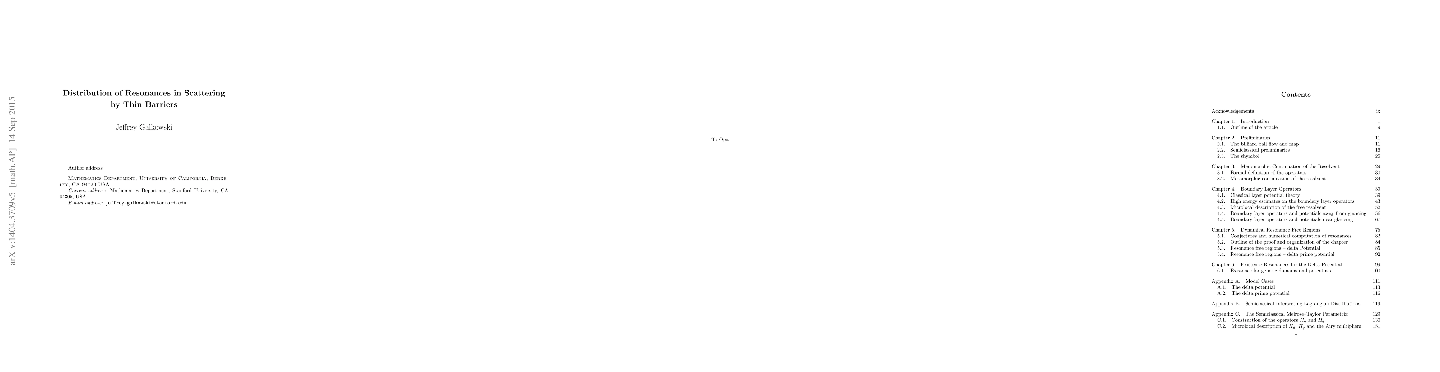 This paper investigates high energy resonances in quantum systems modeled by operators involving thin barriers, providing a quantum version of the Sabine Law for both $\delta$ and $\delta'$ interactions. It reveals that the decay rates of resonances are governed by the system's ray dynamics and the average reflectivity and chord length of the barrier, with specific insights into resonance-free regions and optimal convergence rates.
