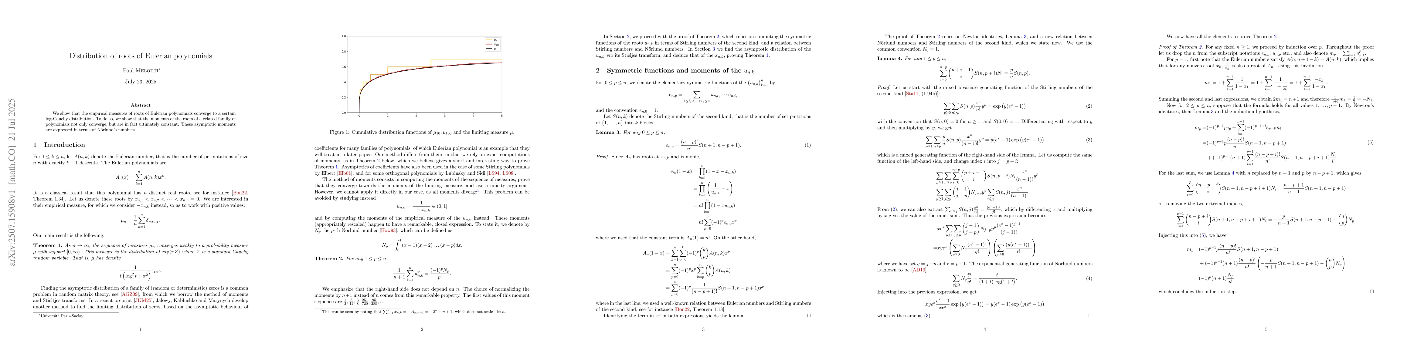 We show that the empirical measures of roots of Eulerian polynomials converge to a certain log-Cauchy distribution. To do so, we show that the moments of the roots of a related family of polynomials not only converge, but are in fact ultimately constant. These asymptotic moments are expressed in terms of N\"orlund's numbers.