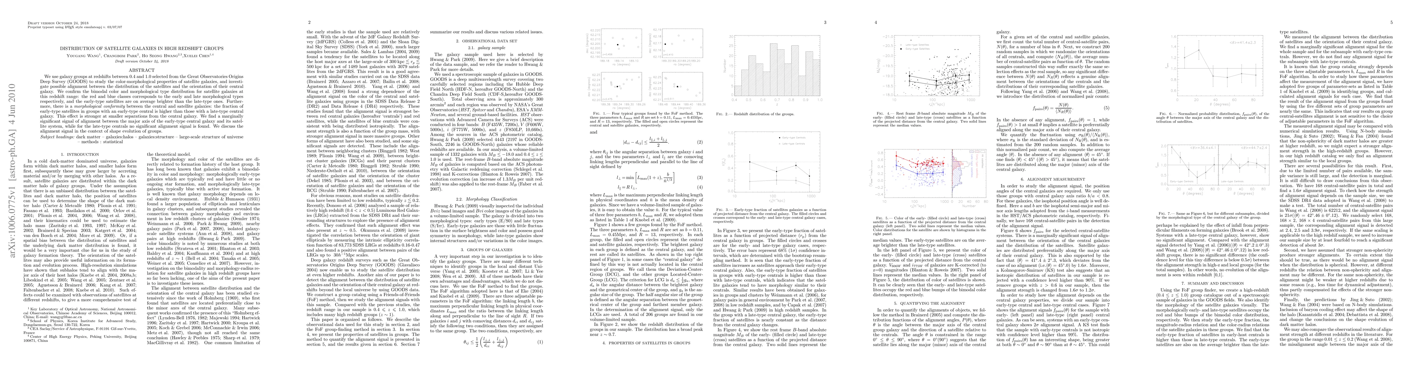 This study examines satellite galaxies in high redshift groups from the GOODS survey, confirming a bimodal color-morphological distribution and finding a stronger morphological conformity in groups with early-type central galaxies. A marginally significant alignment is observed between early-type central galaxies and their satellite systems.
