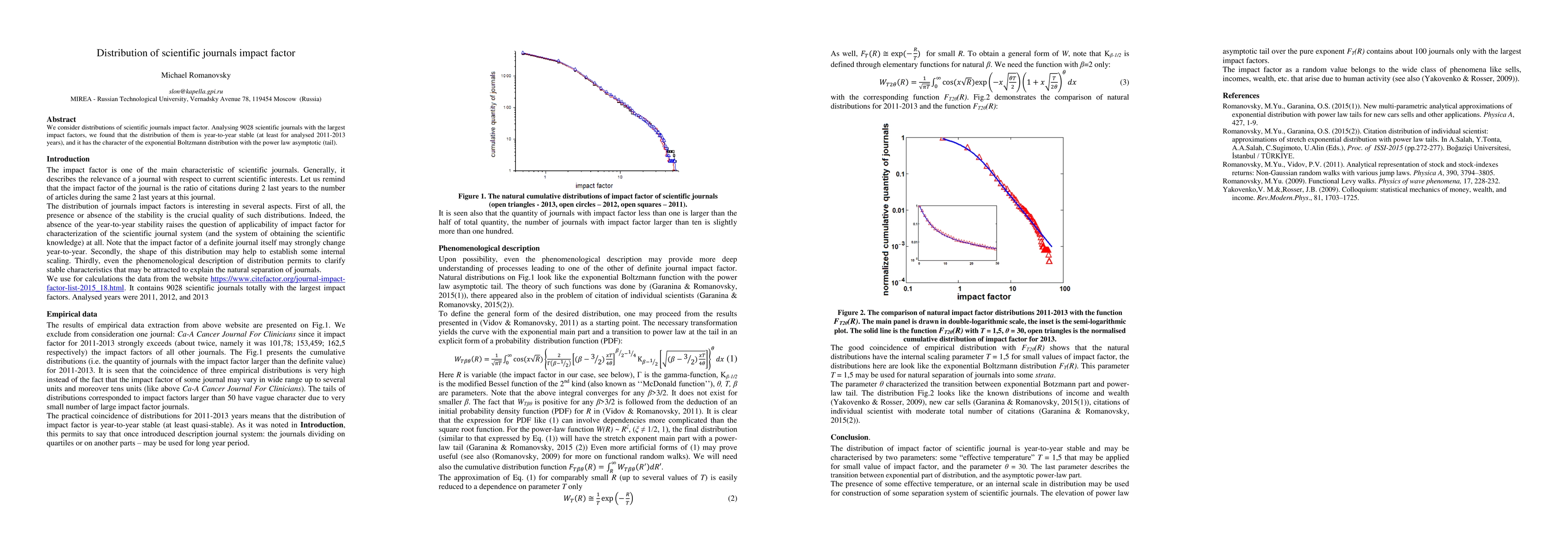 Summary: The study analyzes the distribution of impact factors for 9028 high-impact scientific journals from 2011-2013, revealing a stable year-to-year exponential Boltzmann distribution with a power law tail.