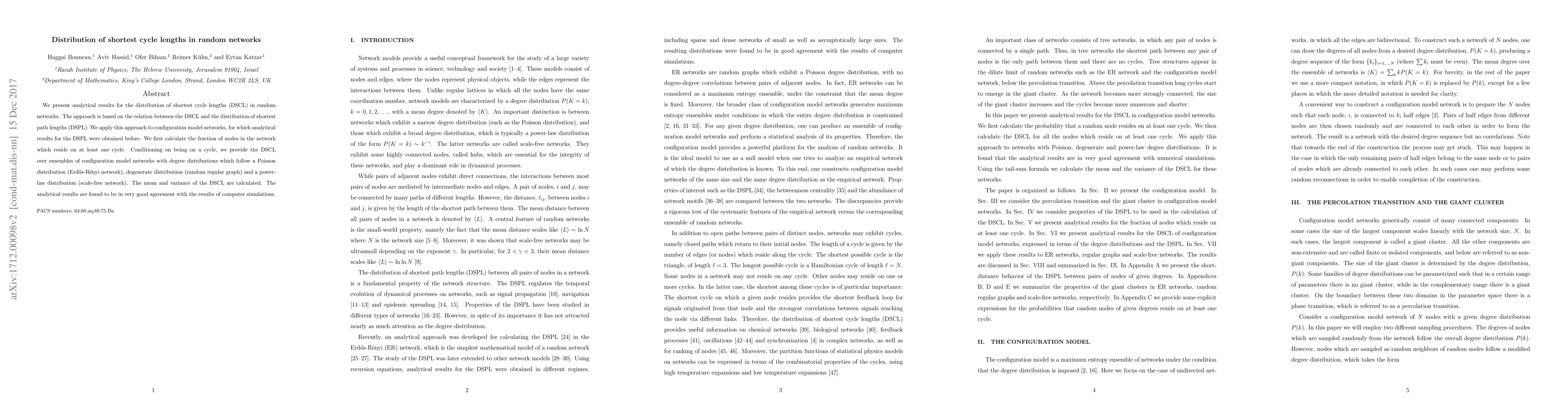 This paper presents analytical results for the distribution of shortest cycle lengths in random networks, using the relation between cycle and path lengths. It applies this to configuration models with different degree distributions, calculating mean and variance, and finds strong agreement with simulations.