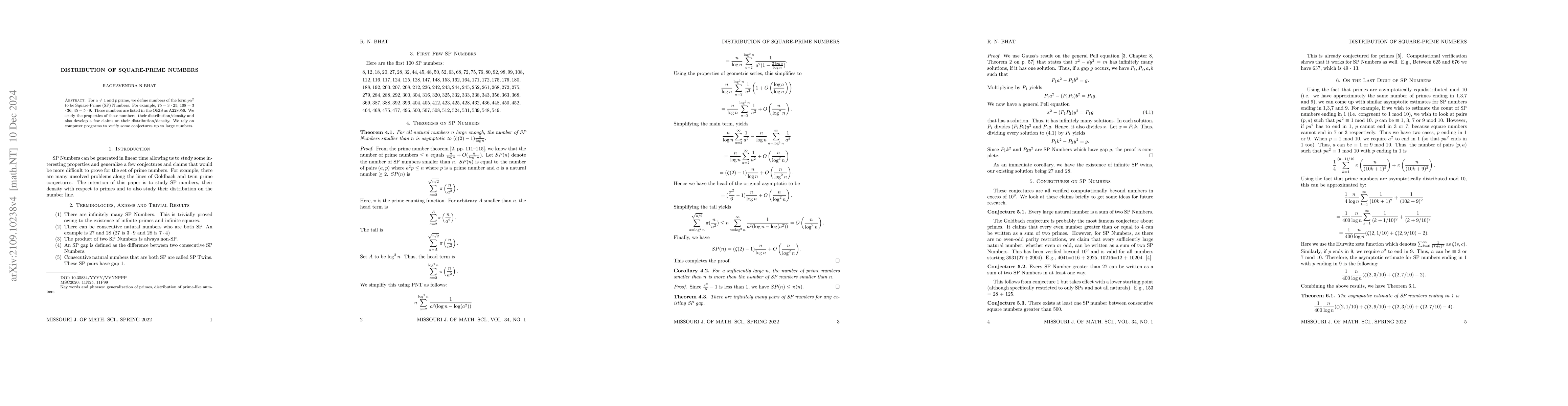 This paper investigates "Square-Prime" numbers of the form $pa^2$ where $p$ is prime and $a \neq 1$. It explores their properties, distribution, and density, supported by computational verification of conjectures.