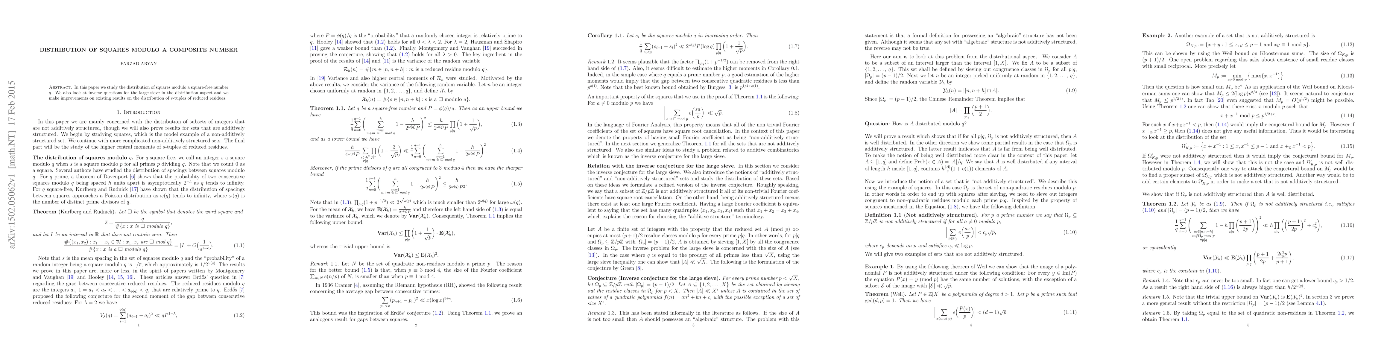 This paper investigates the distribution of quadratic residues modulo square-free numbers, explores inverse problems related to the large sieve, and enhances current findings on the distribution of $s$-tuples of reduced residues.