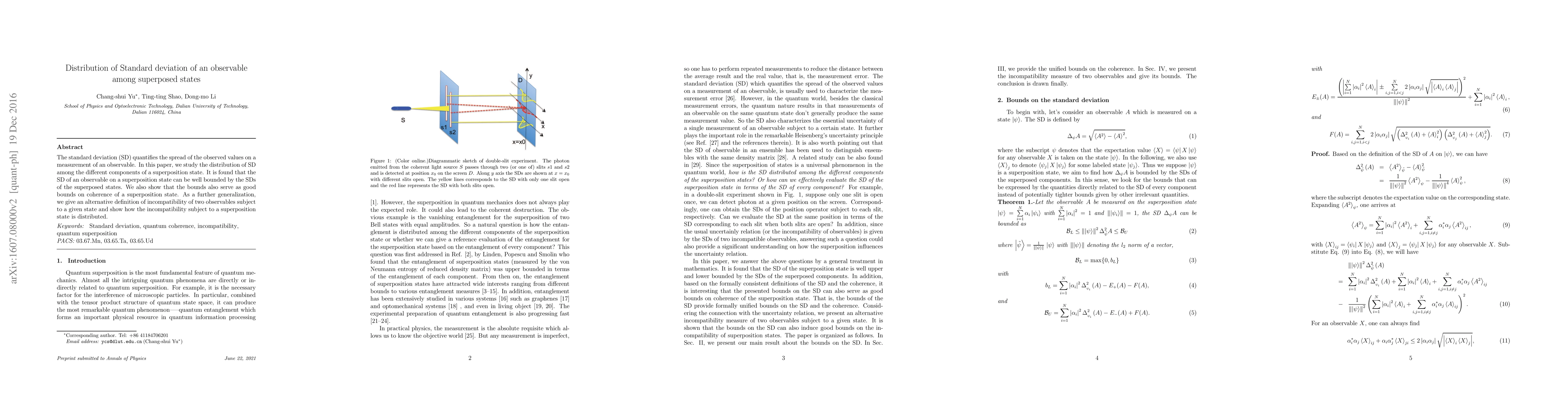 The standard deviation (SD) quantifies the spread of the observed values on a measurement of an observable. In this paper, we study the distribution of SD among the different components of a superposition state. It is found that the SD of an observable on a superposition state can be well bounded by the SDs of the superposed states. We also show that the bounds also serve as good bounds on coherence of a superposition state. As a further generalization, we give an alternative definition of incompatibility of two observables subject to a given state and show how the incompatibility subject to a superposition state is distributed.