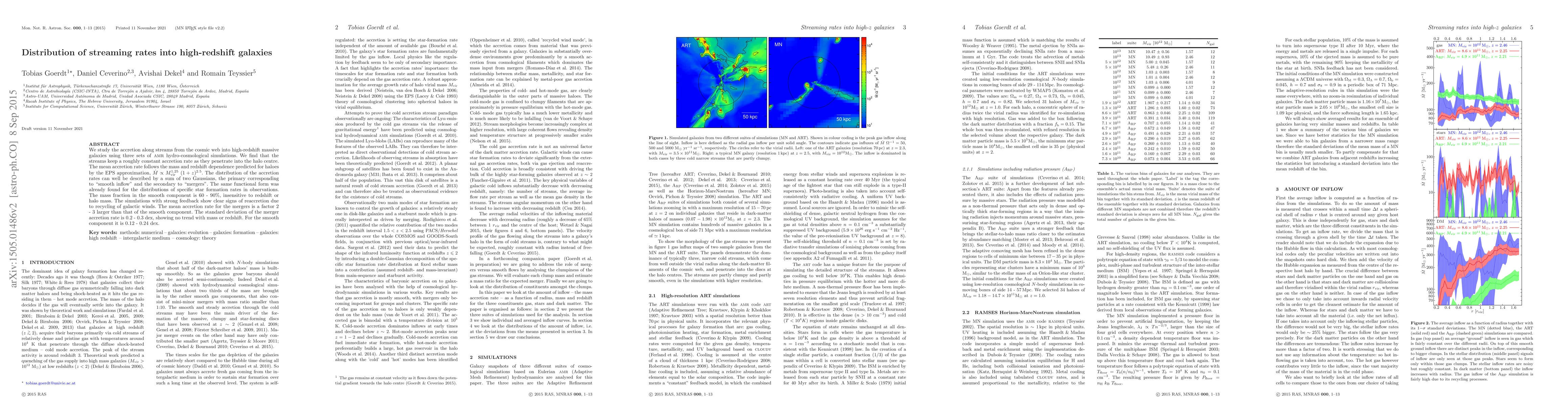 We study the accretion along streams from the cosmic web into high-redshift massive galaxies using three sets of AMR hydro-cosmological simulations. We find that the streams keep a roughly constant accretion rate as they penetrate into the halo centre. The mean accretion rate follows the mass and redshift dependence predicted for haloes by the EPS approximation, dM / dt is proportional to Mvir^{1.25} (1 + z)^{2.5}. The distribution of the accretion rates can well be described by a sum of two Gaussians, the primary corresponding to "smooth inflow" and the secondary to "mergers". The same functional form was already found for the distributions of specific star formation rates in observations. The mass fraction in the smooth component is 60 - 90 %, insensitive to redshift or halo mass. The simulations with strong feedback show clear signs of reaccretion due to recycling of galactic winds. The mean accretion rate for the mergers is a factor 2 - 3 larger than that of the smooth component. The standard deviation of the accretion rate is 0.2 - 0.3 dex, showing no trend with mass or redshift. For the smooth component it is 0.12 - 0.24 dex.