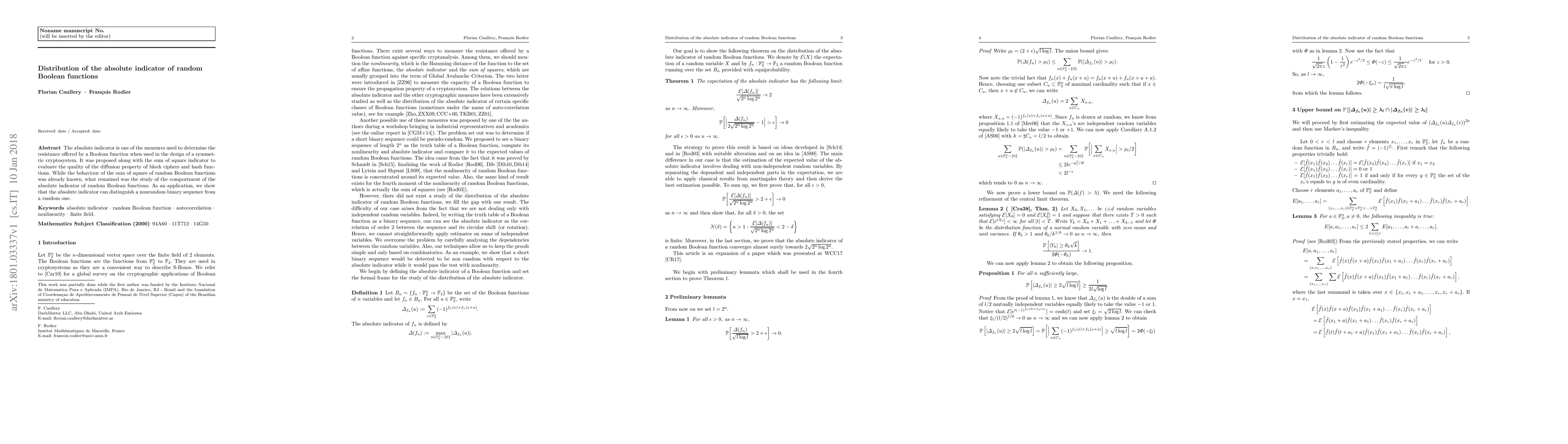 This paper investigates the distribution of the absolute indicator of random Boolean functions, a measure assessing their resistance in cryptographic designs. It demonstrates that the absolute indicator can effectively differentiate between random and nonrandom binary sequences.