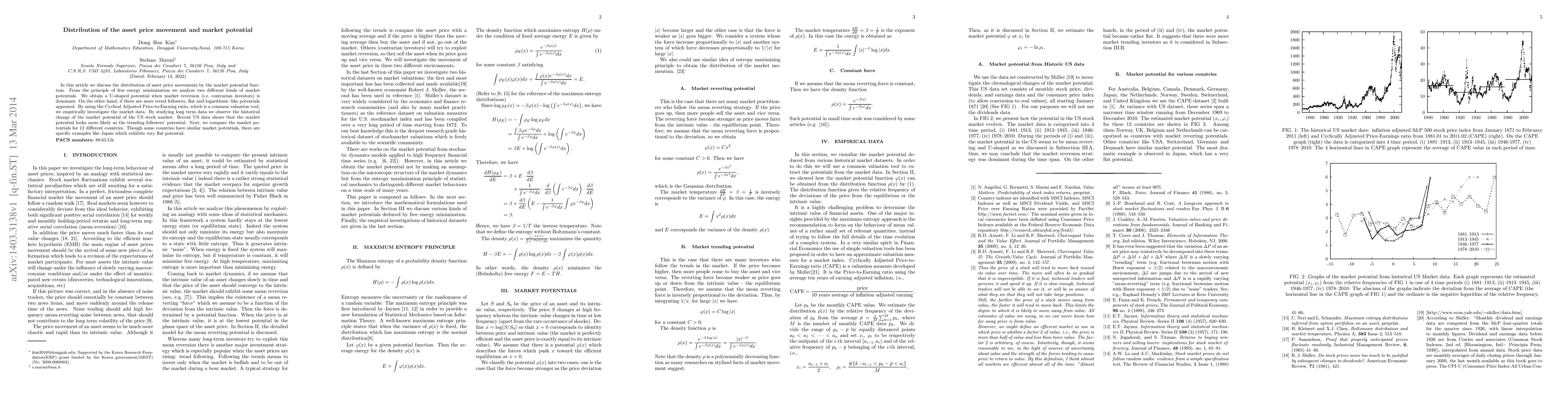 The paper analyzes market potential based on asset price movements, finding a U-shaped potential with dominant reversion and flat-logarithmic potentials with trend followers, with varying results across countries.