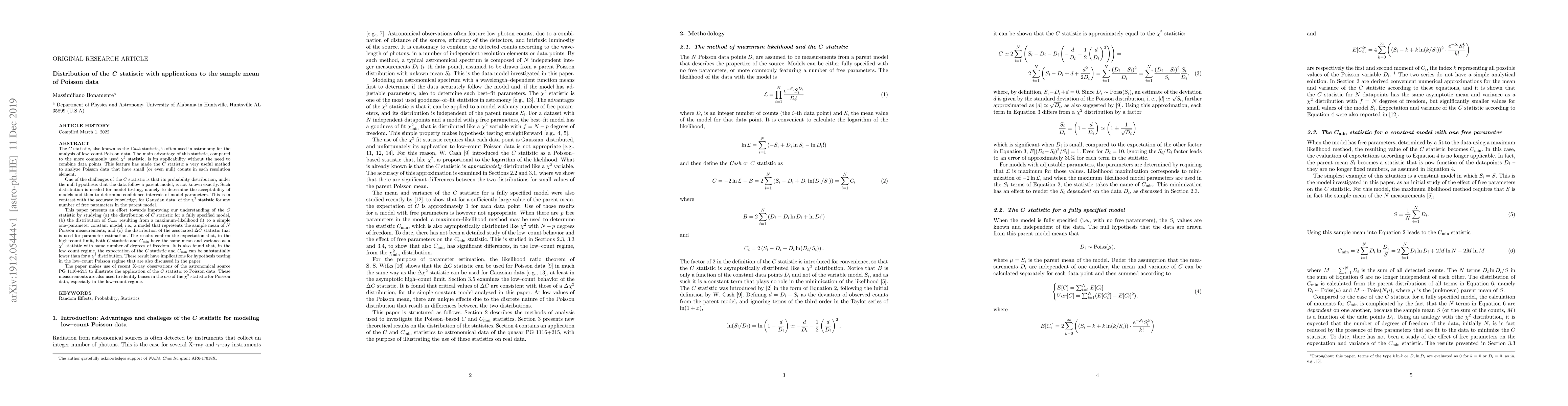 This paper investigates the distribution of the C statistic for low-count Poisson data, revealing its behavior under different conditions and comparing it to the $\chi^2$ statistic. It finds that the C statistic's expectation can be significantly lower than $\chi^2$ in low-count scenarios, impacting hypothesis testing and model parameter estimation.
