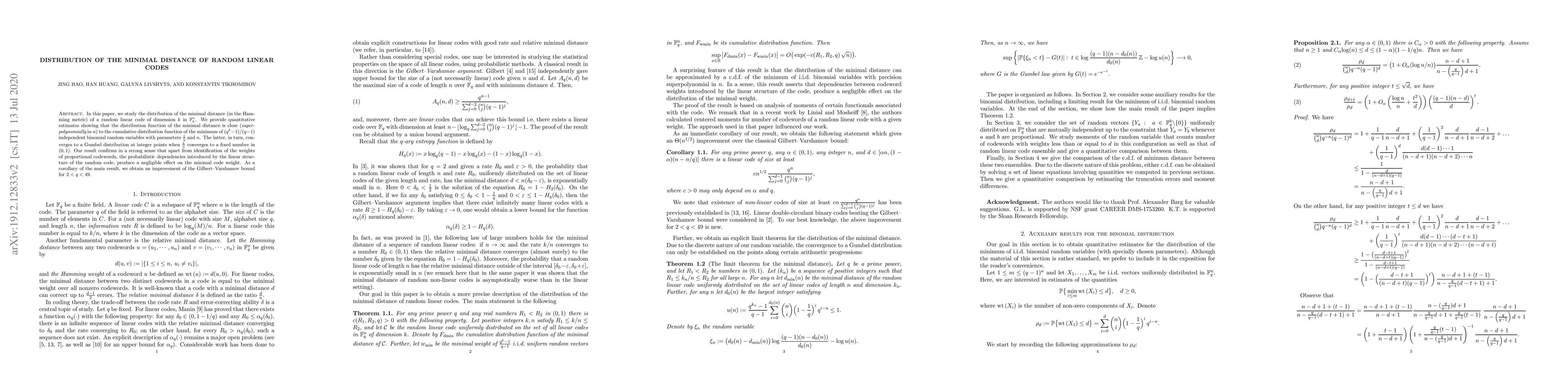 A study on random linear codes shows that the distribution of their minimal distance is approximately equal to the distribution of the minimum of multiple independent binomial variables, with a negligible effect from the code's structure.