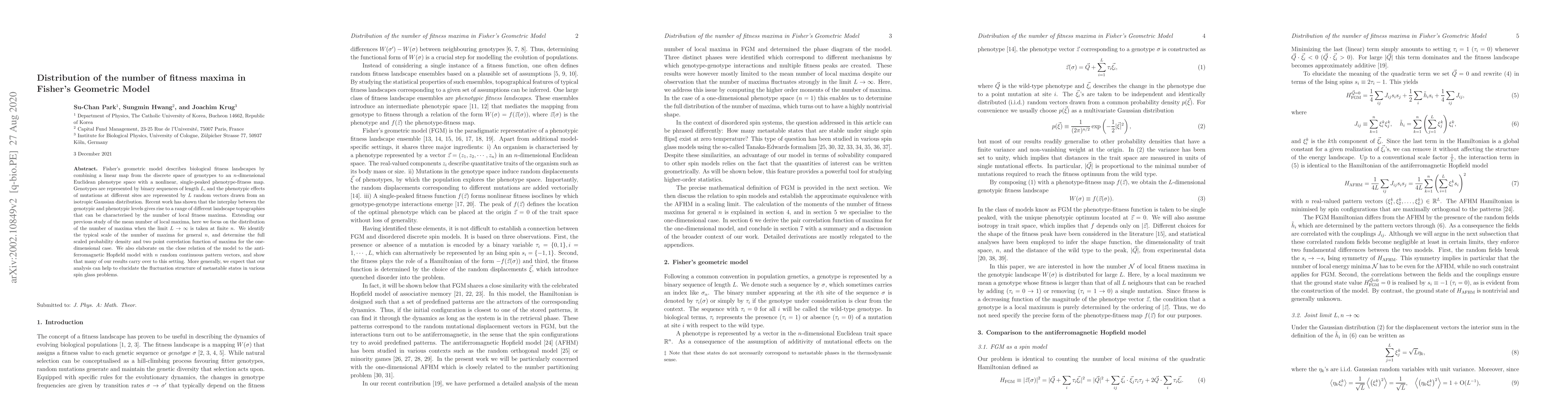 Fisher's geometric model describes biological fitness landscapes by combining a linear map from the discrete space of genotypes to an $n$-dimensional Euclidean phenotype space with a nonlinear, single-peaked phenotype-fitness map. Genotypes are represented by binary sequences of length $L$, and the phenotypic effects of mutations at different sites are represented by $L$ random vectors drawn from an isotropic Gaussian distribution. Recent work has shown that the interplay between the genotypic and phenotypic levels gives rise to a range of different landscape topographies that can be characterised by the number of local fitness maxima. Extending our previous study of the mean number of local maxima, here we focus on the distribution of the number of maxima when the limit $L \to \infty$ is taken at finite $n$. We identify the typical scale of the number of maxima for general $n$, and determine the full scaled probability density and two point correlation function of maxima for the one-dimensional case. We also elaborate on the close relation of the model to the anti-ferromagnetic Hopfield model with $n$ random continuous pattern vectors, and show that many of our results carry over to this setting. More generally, we expect that our analysis can help to elucidate the fluctuation structure of metastable states in various spin glass problems.