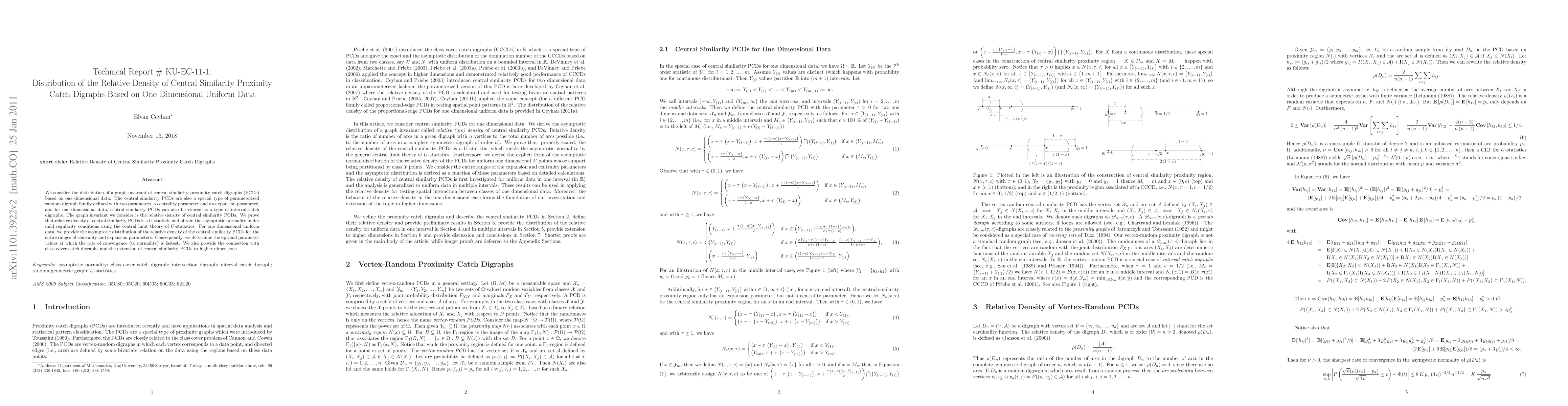 This paper investigates the distribution of the relative density of central similarity proximity catch digraphs (PCDs) derived from one-dimensional uniform data. It establishes the relative density as a U-statistic and proves its asymptotic normality under mild conditions, determining optimal parameter values for the fastest convergence.