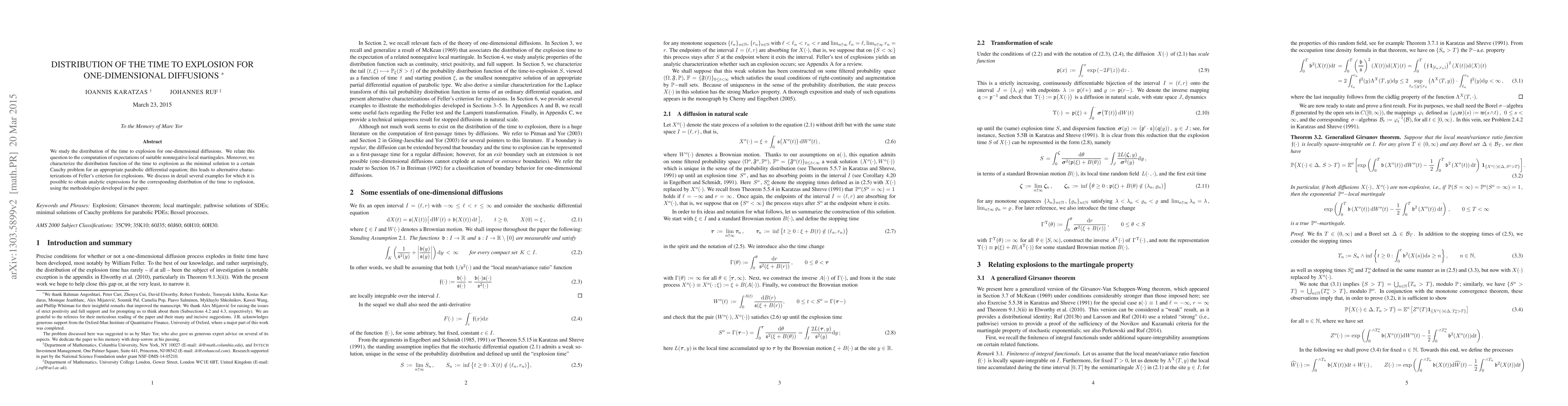 This paper investigates the time to explosion for one-dimensional diffusions, linking it to nonnegative local martingales and related diffusions. It characterizes the distribution function via a parabolic differential equation and provides analytic expressions for several examples.