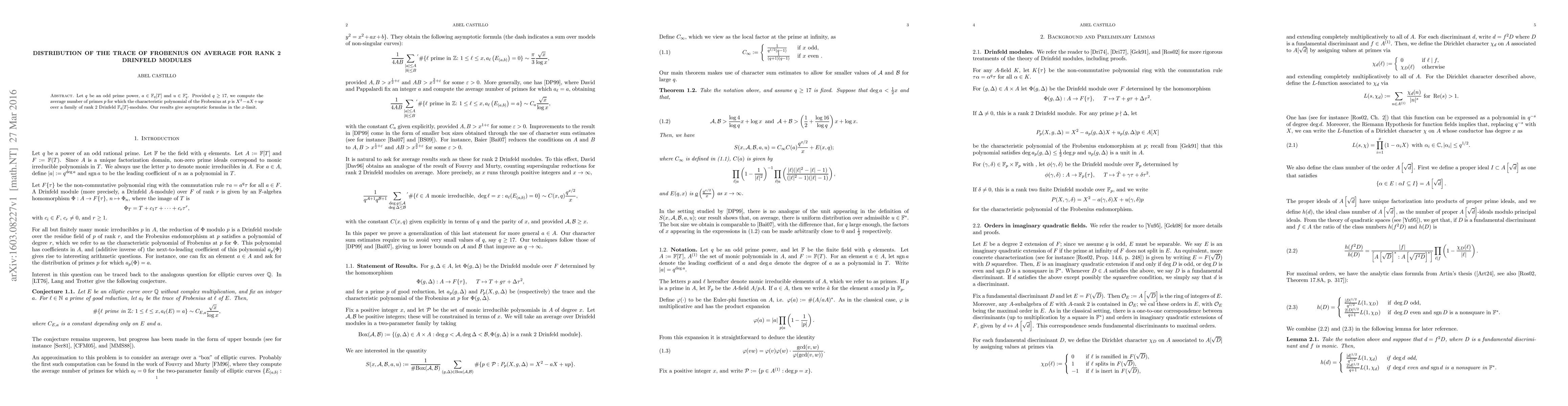 Let $q$ be an odd prime power, $a \in \mathbb{F}_q[T]$ and $u \in \mathbb{F}_q^*$. Provided $q \geq 17$, we compute the average number of primes $p$ for which the characteristic polynomial of the Frobenius at $p$ is $X^2 - aX + up$ over a family of rank 2 Drinfeld $ \mathbb{F}_q[T]$-modules. Our results give asymptotic formulas in the $x$-limit.