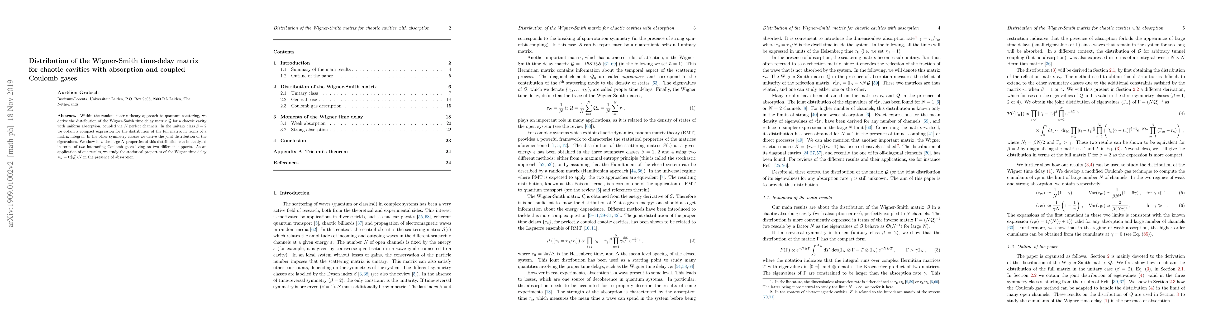 This paper derives the distribution of the Wigner-Smith time-delay matrix for chaotic cavities with absorption and coupled via $N$ channels, obtaining a compact expression in the unitary class. The study also analyzes the large $N$ properties in terms of two interacting Coulomb gases, and applies the results to the statistical properties of the Wigner time delay in the presence of absorption.