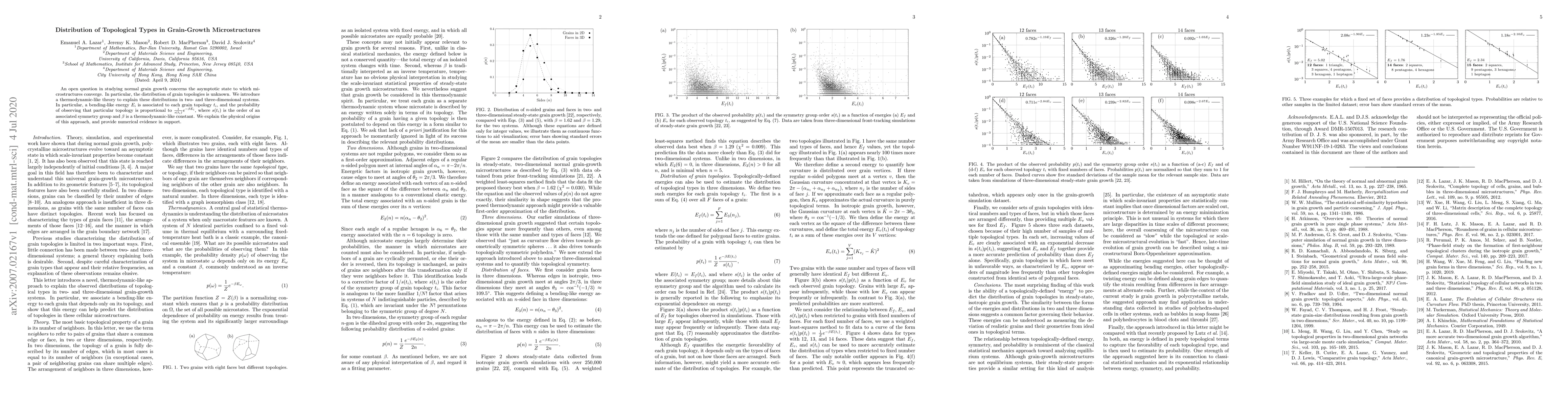 An open question in studying normal grain growth concerns the asymptotic state to which microstructures converge. In particular, the distribution of grain topologies is unknown. We introduce a thermodynamic-like theory to explain these distributions in two- and three-dimensional systems. In particular, a bending-like energy $E_i$ is associated to each grain topology $t_i$, and the probability of observing that particular topology is proportional to $\frac{1}{s(t_i)}e^{-\beta E_i}$, where $s(t_i)$ is the order of an associated symmetry group and $\beta$ is a thermodynamic-like constant. We explain the physical origins of this approach, and provide numerical evidence in support.
