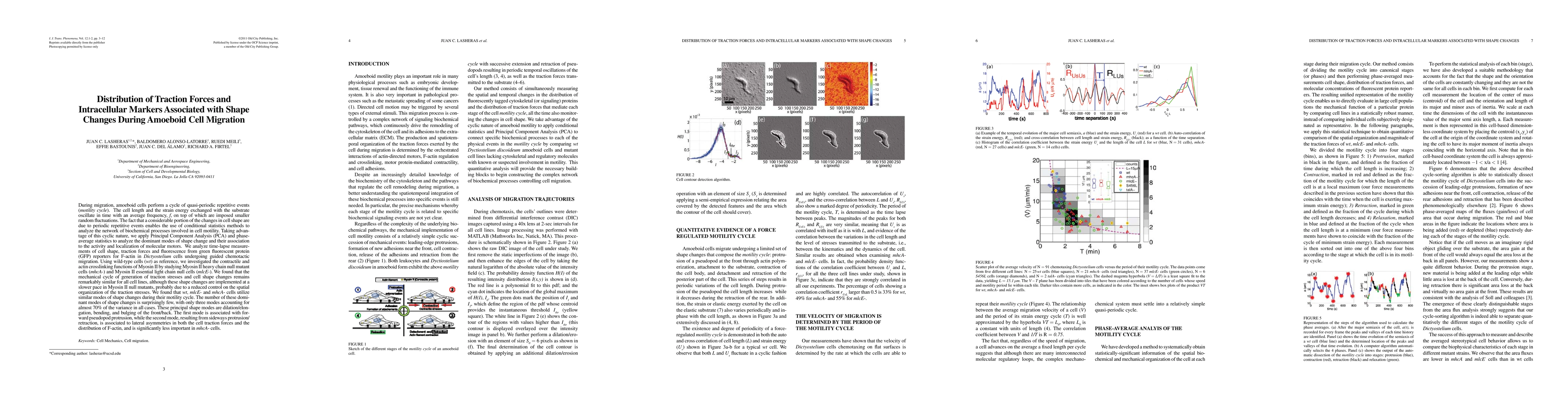 During migration, amoeboid cells perform a cycle of quasi-periodic repetitive events (motility cycle). the cell length and the strain energy exchanged with the substrate oscillate in time with an average frequency, f, on top of which are imposed smaller random fluctuations. the fact that a considerable portion of the changes in cell shape are due to periodic repetitive events enables the use of conditional statistics methods to analyze the network of biochemical processes involved in cell motility. taking advan- tage of this cyclic nature, we apply Principal Component analysis (PCa) and phase- average statistics to analyze the dominant modes of shape change and their association to the activity and localization of molecular motors. We analyze time-lapse measure- ments of cell shape, traction forces and fluorescence from green fluorescent protein (GfP) reporters for f-actin in Dictyostelium cells undergoing guided chemotactic migration. using wild-type cells (wt) as reference, we investigated the contractile and actin crosslinking functions of myosin II by studying myosin II heavy chain null mutant cells (mhcA-) and myosin II essential light chain null cells (mlcE-).