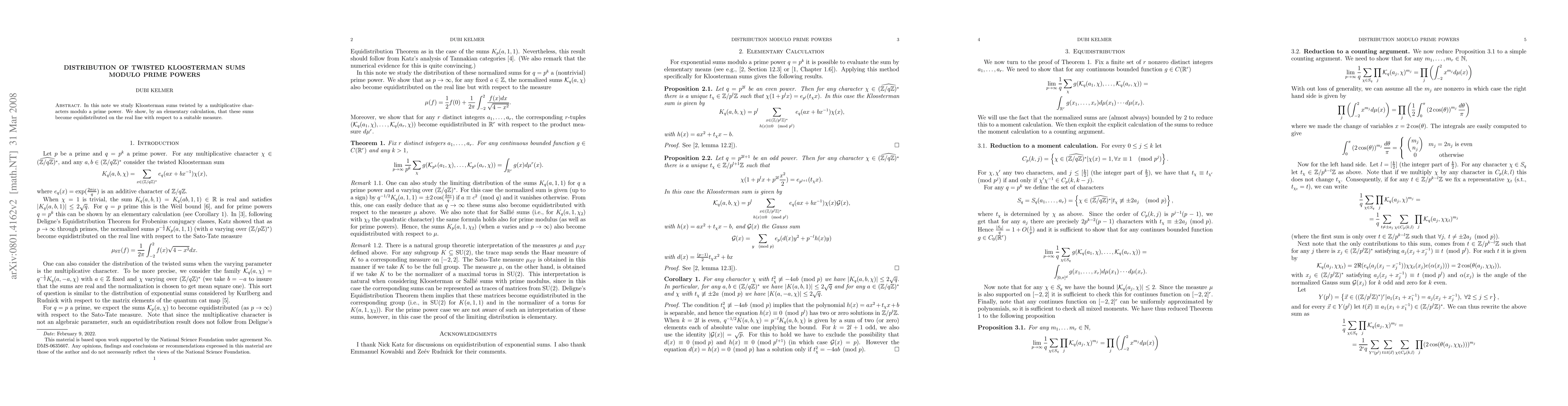 Summary: This paper investigates twisted Kloosterman sums under multiplicative characters modulo prime powers, demonstrating through elementary calculations that these sums equidistribute on the real line according to a specific measure.