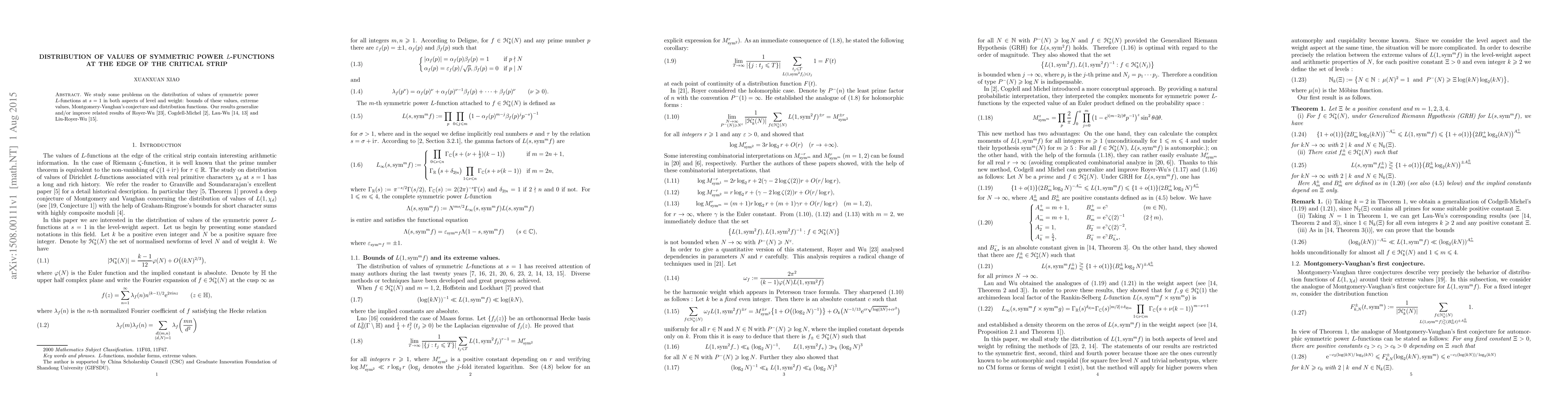 This paper investigates the distribution of values of symmetric power $L$-functions at $s=1$, focusing on bounds, extreme values, and distribution functions. It generalizes and enhances previous findings by Royer-Wu, Cogdell-Michel, Lau-Wu, and Liu-Royer-Wu.