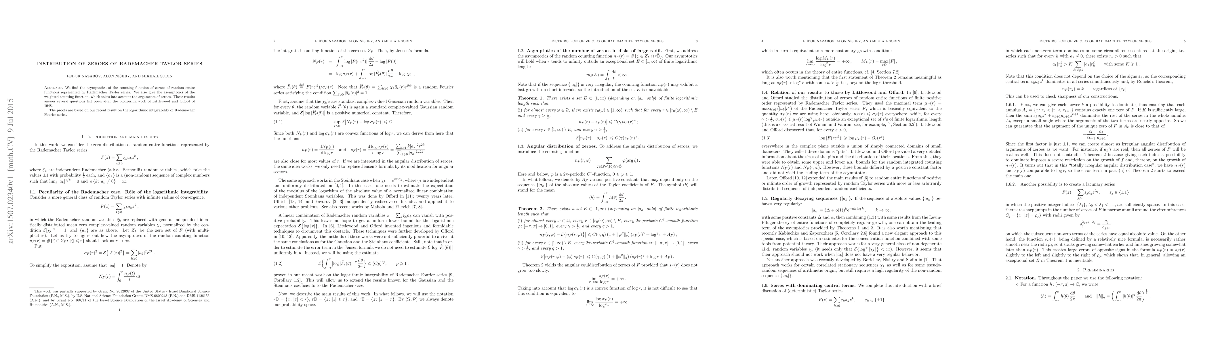 This paper investigates the asymptotic behavior of zeroes in random entire functions represented by Rademacher Taylor series, providing results for both the counting function and the weighted counting function considering zero arguments. The findings build on recent results regarding the logarithmic integrability of Rademacher Fourier series.