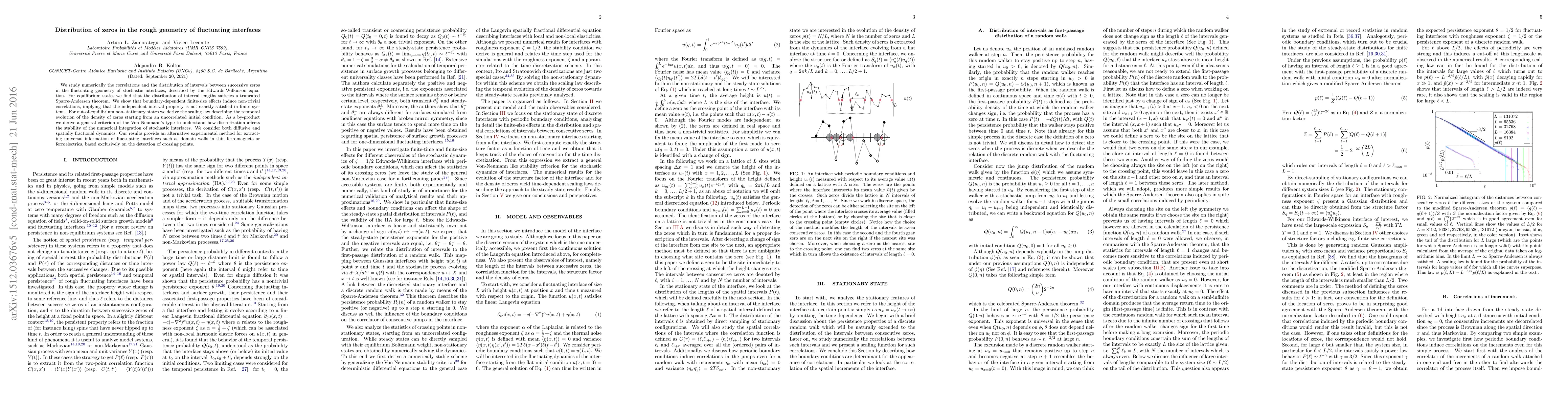 This research numerically investigates the distribution and correlations of zeros in stochastic interfaces modeled by the Edwards-Wilkinson equation, revealing a truncated Sparre-Andersen theorem for equilibrium states and non-trivial correlations due to finite-size effects. It also derives a scaling law for the temporal evolution of zeros in non-stationary states, offering a criterion for numerical integration stability and suggesting an alternative method for extracting universal properties of fluctuating interfaces.