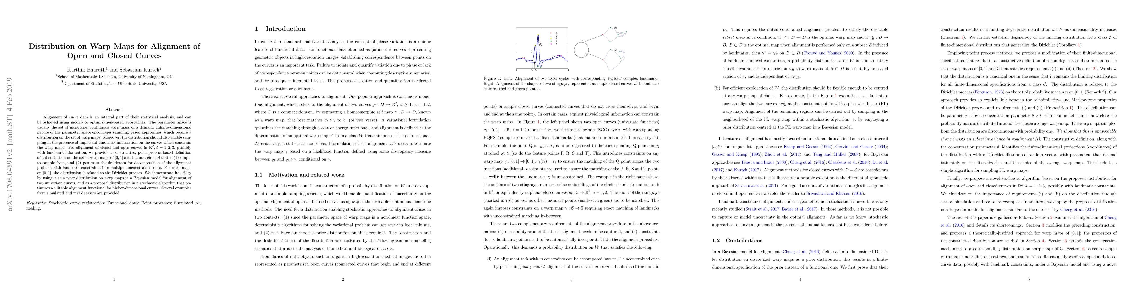 Alignment of curve data is an integral part of their statistical analysis, and can be achieved using model- or optimization-based approaches. The parameter space is usually the set of monotone, continuous warp maps of a domain. Infinite-dimensional nature of the parameter space encourages sampling based approaches, which require a distribution on the set of warp maps. Moreover, the distribution should also enable sampling in the presence of important landmark information on the curves which constrain the warp maps. For alignment of closed and open curves in $\mathbb{R}^d, d=1,2,3$, possibly with landmark information, we provide a constructive, point-process based definition of a distribution on the set of warp maps of $[0,1]$ and the unit circle $\mathbb{S}^1$ that is (1) simple to sample from, and (2) possesses the desiderata for decomposition of the alignment problem with landmark constraints into multiple unconstrained ones. For warp maps on $[0,1]$, the distribution is related to the Dirichlet process. We demonstrate its utility by using it as a prior distribution on warp maps in a Bayesian model for alignment of two univariate curves, and as a proposal distribution in a stochastic algorithm that optimizes a suitable alignment functional for higher-dimensional curves. Several examples from simulated and real datasets are provided.